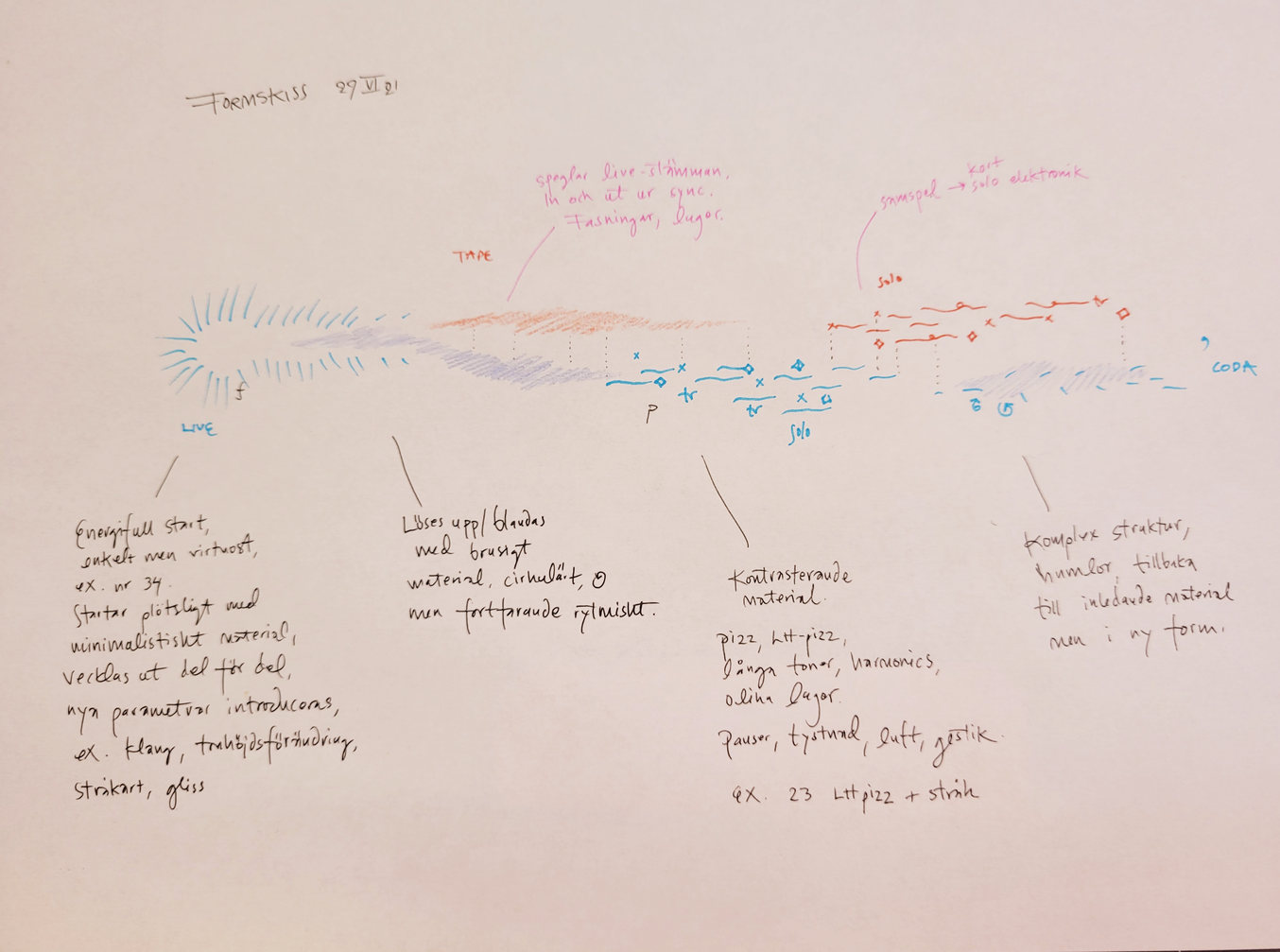 Following our discussions on form, Henrik asks me to suggest an overarching form for the piece. The new task of being the work’s architect is joyful but at the same time challenging. New creative paths are being drawn inside of me. I want to create a complete masterplan, but also to keep things open for Henrik to build on further. The timeline I’m drawing divides into the solo violin voice and the pre-recorded tape, and where symbols and colors are not enough, I add written descriptions. I send my sketch to Henrik to be negotiated. He notices how it carries similarities to the form he has imagined, drawn on his whiteboard.