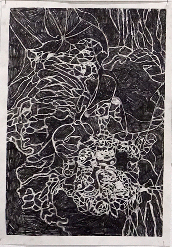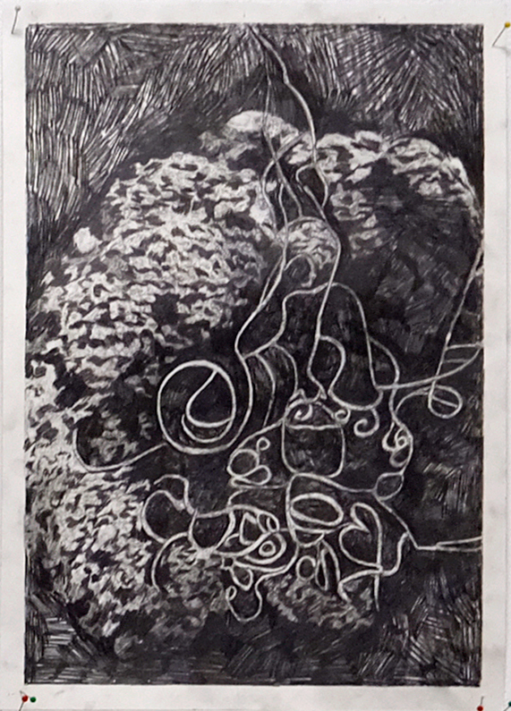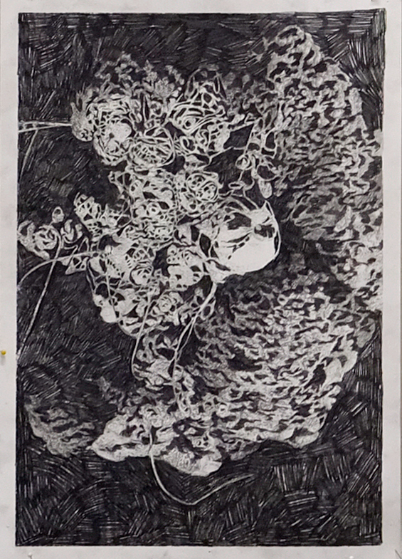 Sustained awareness, attention, and focus make the three dimensional visible at a glance, yet pull the gaze towards and inwards. The wild and free alternations of the pencil invite entry into a fugue conjured with patience and craft. The drawings are an invitation into the imaginary and the dreamlike—to a place where transformation transpires and form is transfigured into textured patterns in an unruly unity. Contemplation can be traced through movement and sense. Focus seen through expansion, enlargement, and revelation. Bursts of sharp concentration felt through unperturbed motion and action. The artist understood to be drawing from experience in order to experience.