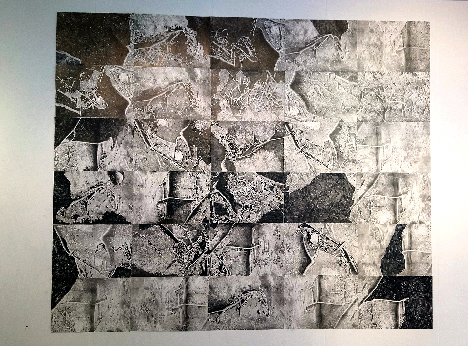 The photograpic image is transfered via a risograph onto a surface that is suitable for drawing. The visual intrepretation happens in the organic structure, in the space between, in the rythms and in the lines. The drawing process is like drawing in pixels – while each module is a A3 format. Throughout the prosess the drawings are composisioned, arranged and rearranged, with the intention to form a new image still unknown and unseen - while some of the underlying and known image is still visible like fragments and fractals of the wholeness.