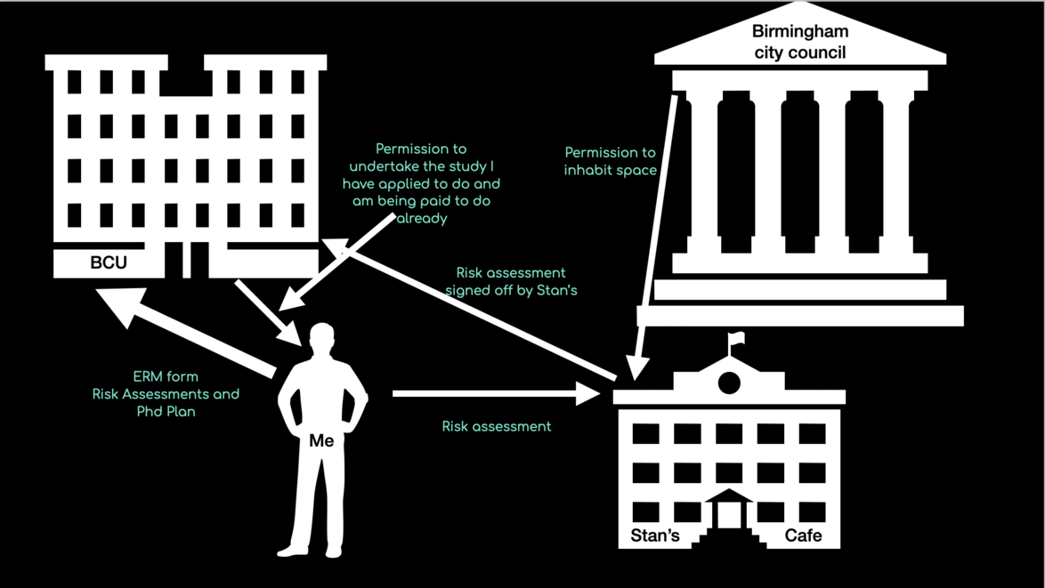 due to the pandemic, i was required by bcu to have completed a risk assessment before going to stan's cafe. i was also expected to complete an erm (ethics review), in which i have to detail all of the ethical issues and risks and how i planned to deal with them in my project. i also needed to submit a phd plan to bcu, detailing everything i planmed to do over the next six months with stan's cafe, for further ethical consideration. these forms, although tedious, i was able to fill out, however, certain questions required me to have some sort of experience of how stan's cafe are currently running, who is there on a regular basis, what work they are making and what they are planning.