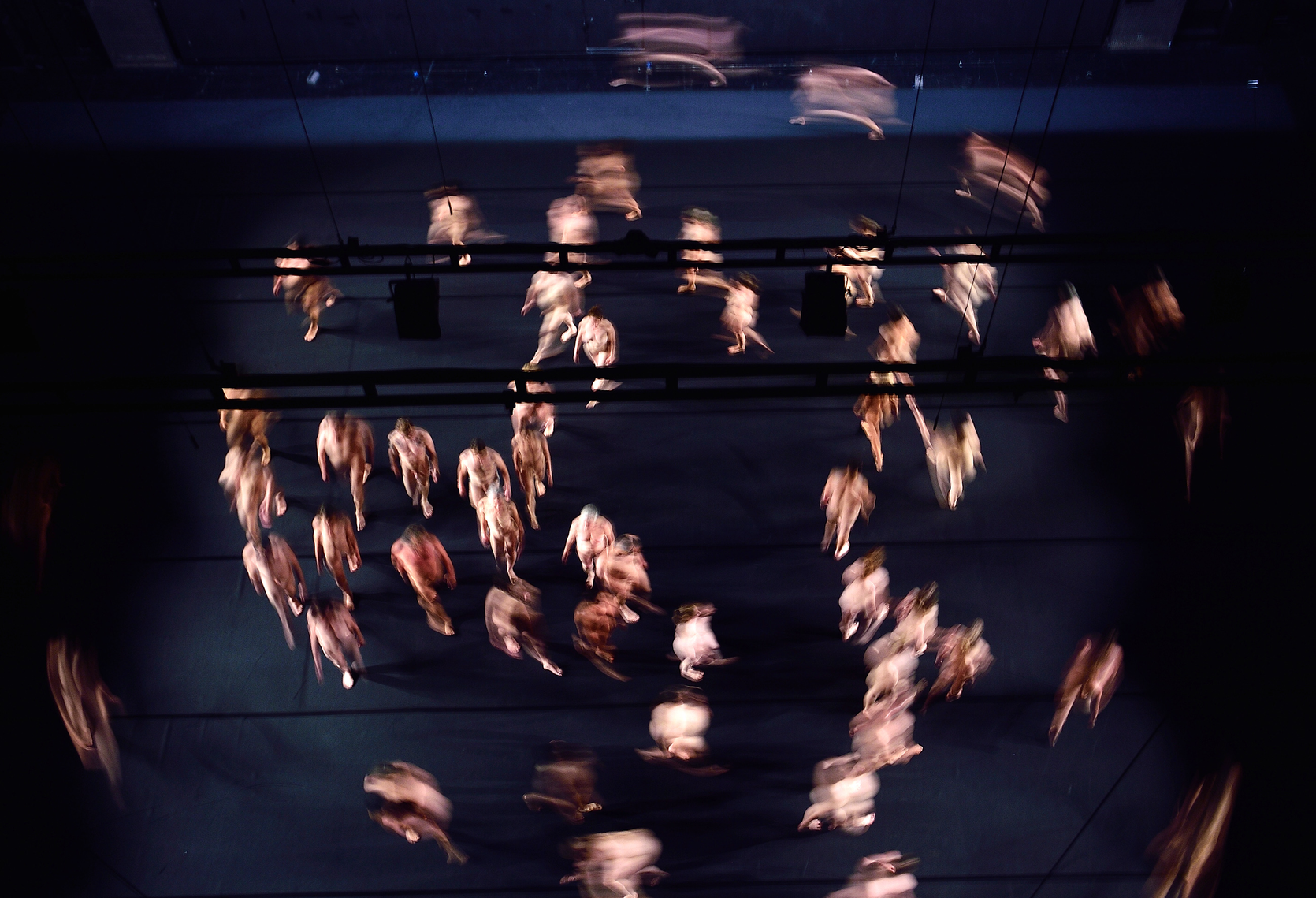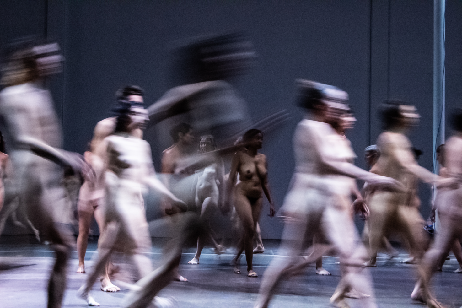 'Two homeless men argue about what they are watching. “It’s a protest,” insists one of them. “For what?” asks the other. “Can’t you see? It’s for freedom,” the former insists. To prove his point, he joins the moving swarm, holding his paper cup as he runs. As the performers stretch out a hand to rest on their peers’ shoulders, the homeless man becomes part of a moving trio.'