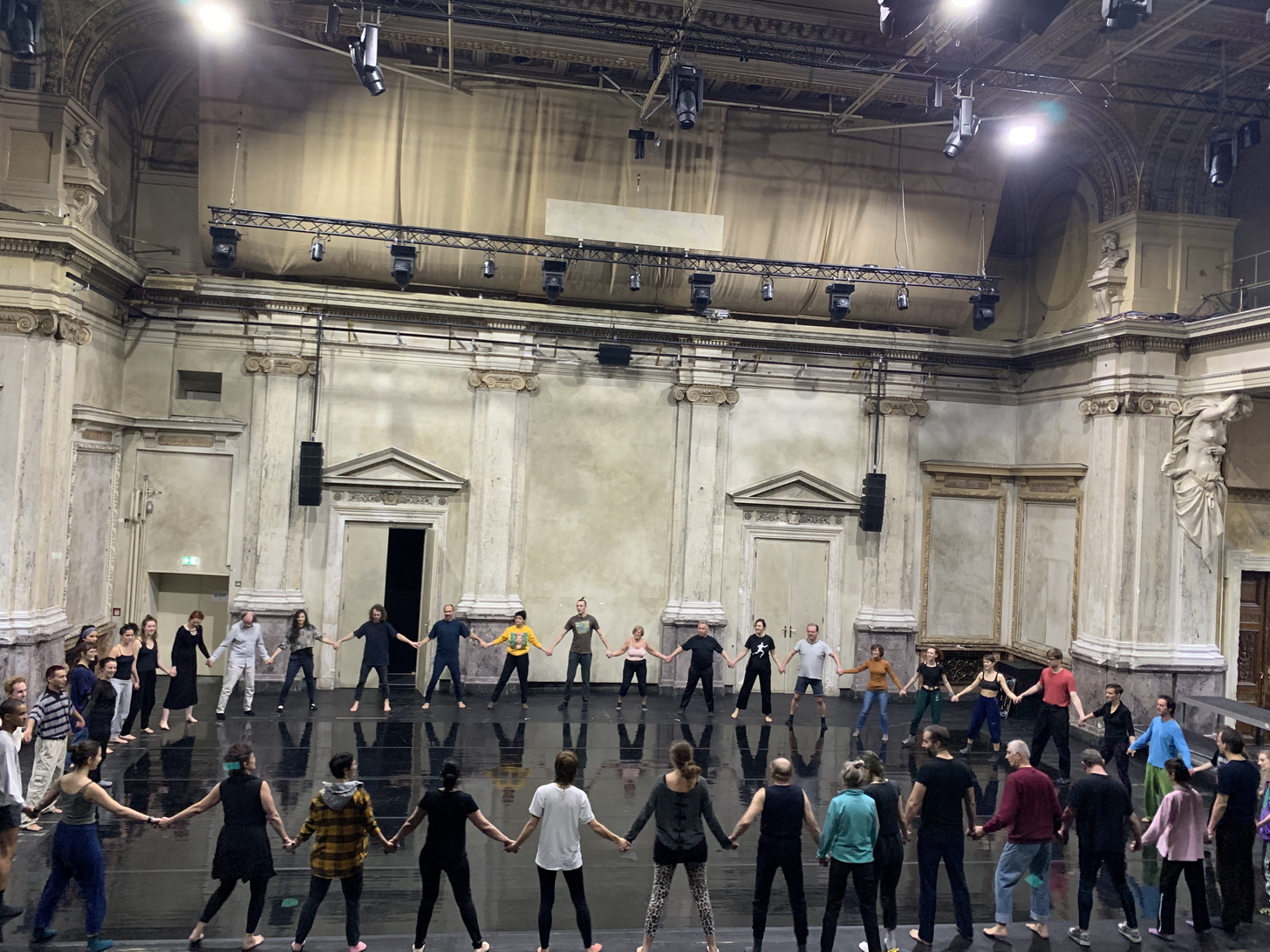 Warming up before performing in Burgtheater, Vienna, 2020, during the programme EUROPE MACHINE curated by director Oliver Frljić and the philosopher and activist Srećko Horvat.