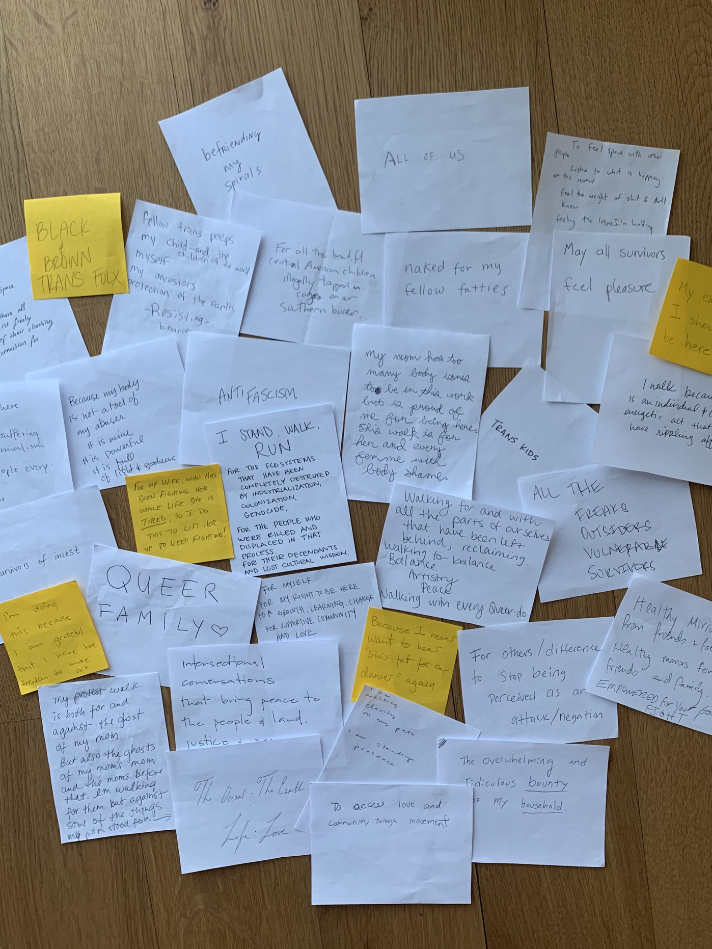 This is a way of rooting the collective and group work back into the individual urgency and for the work and process to be able of hosting and housing different histories and causes simultaneously. One way of doing this is to invite each person anonymously to write down for whom or for what they stand and walk. Then these notes are shared (if agreed upon) and read by the collective just before doing the score. While walking and running there is a resonance of multiple intentions fuling the group and