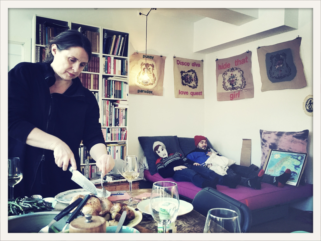Stranger within, Jassem Hindi and Mia Habib, doing their practice, Dance against food, performing in people’s houses in exchange for a dinner. Dance against food was a project initiated in the 2000s in Morocco by choreographer Taoufiq Izzidiou under the name Danse contre nourriture. He then very generously allowed us to use this framework, and we have been doing so for years, and around the world.