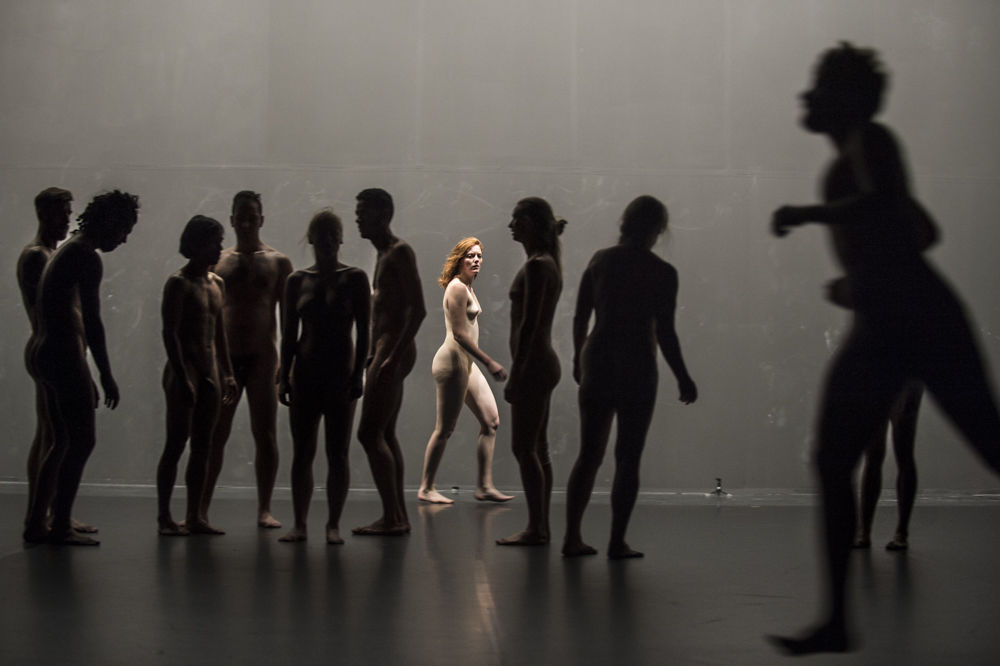 Mia Habib: If you think of the physical aspect of it, when we did A song to… my initial idea was just, “we need 50 more bodies on stage,” and I thought, “Oh, they should look different,” as if the body and who the person is are different. Then when people arrived I thought, “Oh, it’s people, with histories, who talk differently, take space differently, move differently, have different communities, have different conceptions of society.” And slowly, that took over for me, who people are, rather than what it looks like. Through doing A song to… in different places, we had some amazing experiences that, in the beginning, was just a default. In Germany, for example, we had a homeless man and then a former policeman running and walking together and we didn’t realize until after. We had priests and performers, and then those that are isolated from people. Somehow there was a large variety of backgrounds of people and how they function in society. That became important. Then also how people negotiated the space. And then also bringing in people who perceive the world and information differently, like someone who is 55 but lives at home—but not to point this out as different, but finding a way of facilitating the group—to find a language for everyone, rather than doing something special. So, in that work of negotiating difference and creating space that wouldn’t signal out people, that became the methodology. Bringing in the word “all” became about who can that person be. In the world of dance, when you have different bodies on stage, I hear my colleagues saying, “wow, it’s so diverse.” And I say, “What do you mean, ‘diverse,’ when everyone on the stage is between 25 and 35, and just because they look a little bit different—what is diversity? It doesn’t take much before we say, “Oh, they’re all on stage.” But I think no, which bodies aren’t on stage? So, I thought bringing this word “ALL,” makes you think of those that aren’t on stage, because there is always someone who is not on stage. You will never get everyone on stage. How wide is that idea of who that can be? Also then, when it comes to nudity, since we’re naked on stage—there is this thing in dance that even within dancers there are certain bodies that are more easily undressed on stage than others’ bodies. In a way, we should be past it but we’re not. There are still questions about what dancer’s body should look like. You can be trained as a professional dancer all your life, but still not look like some idea that people might have. With the idea of a dancer or body in general, there are so many bodies that are hidden, or choose to hide themselves because of this pressure from society. That’s important in this work—not pushing that, but allowing it. Then to take the problematic side of it—an example of the failure of it in a way—was when we did it in Paris. We had to find the volunteers in Paris ourselves, but the outreach part of it wasn’t strong enough. So, we ended up with mainly only white bodies on stage. And in the European context, Paris especially, has had many protests concerning how non-white bodies are treated. You cannot, not anywhere, and especially not in Paris, come and show a piece called ALL – a physical poem of protest, and only come with white people. That’s not acceptable because it reflects society. In a way it becomes a mirror of a society, but on the other hand, in that sense the title was problematic. I wanted to cancel the piece, but it wasn’t possible. In retrospect, I really thought about how you maneouver that. I don’t have an answer, but it’s to give an example of when the title is a bit dangerous.