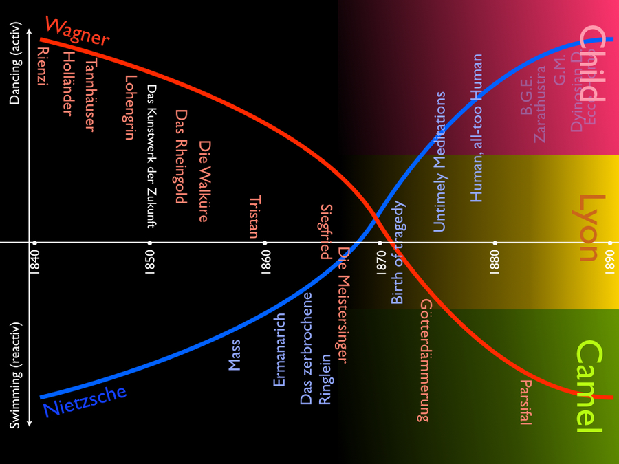 Our diagrammatic representation of the timelines of Wagner’s and Nietzsche’s works serve as a means to visualise Nietzsche’s inner path from the oppressive weight carried in works such as the Miserere and Ermanarich to the fragmentary and dissolved reiterations of his multiple ‘I’s’ in Ecce Homo and other texts from his last period. Concomitantly, one can think of Wagner’s trajectory as increasingly exposing a proto-religious horizon, culminating with Parsifal. Obviously, we are not addressing here the purely aesthetic qualities of Wagner’s last works, whose qualities (and groundbreaking musical potential) passed unnoticed by Nietzsche, who was focused on (and disappointed by) their reactionary narratives. On the other hand, and precisely at this level of musical narratives and dramaturgy, Nietzsche’s Ermanarich, the unfinished Mass, or the fragmentary Christmas Oratorio share a similar reactive character with Wagner’s Ring and Parsifal (in Nietzsche’s interpretation of these works). In this sense, what Nietzsche most dislikes in Wagner might well be those aspects of Wagner that he feels latently, but deeply present in himself, elements of which his music is a testimony and which he constantly tries to overcome: