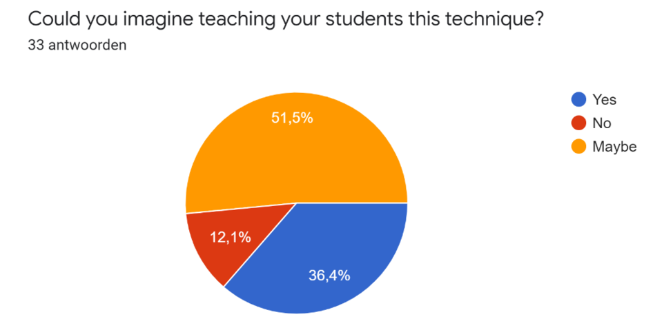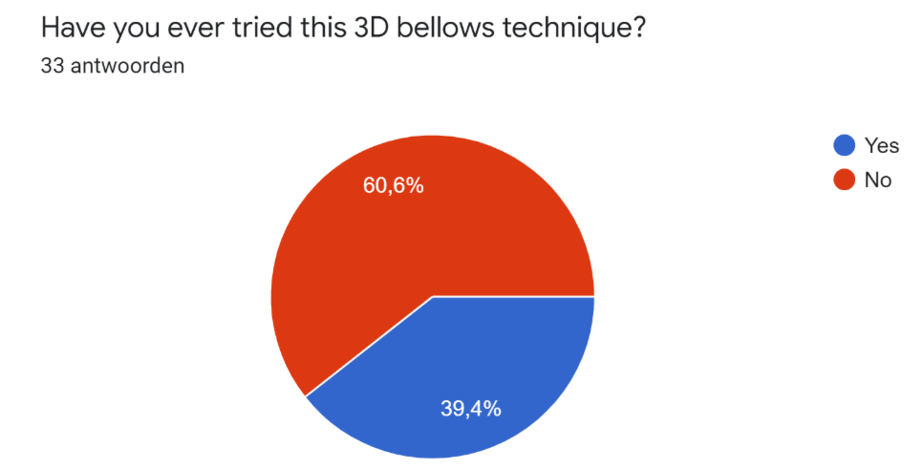 For most of the respondents (20 out of 33), the 3D bellows technique is quite unknown or undiscovered (figure 4). However, most of the respondents considered teaching the 3D bellows technique. 12 out of 33 people answered “yes”, whereas the “maybe” group is the biggest with 17 out of 33. 4 respondents answered negatively. (figure 5)