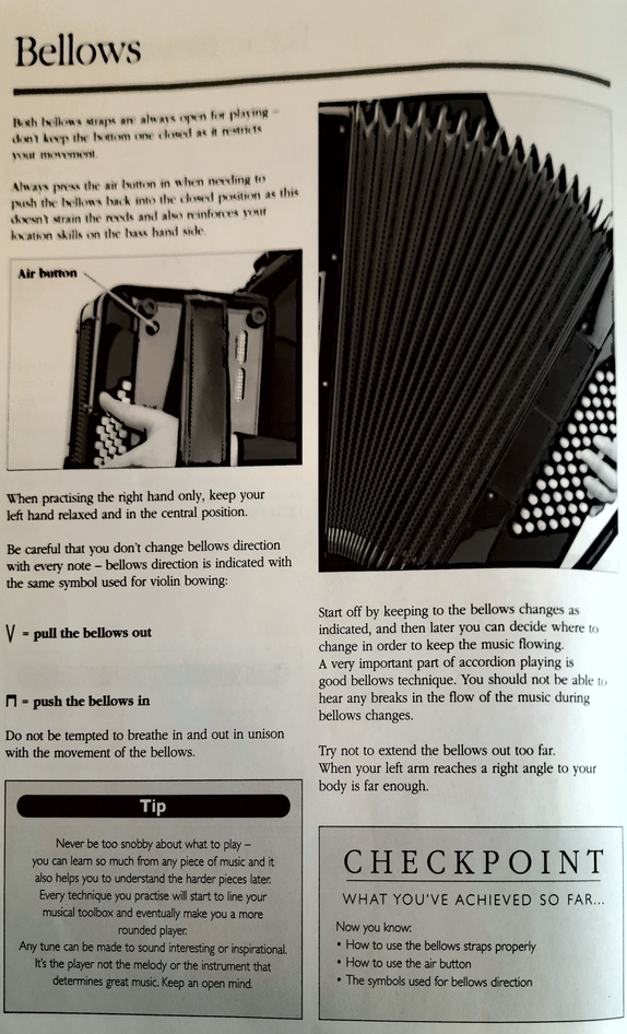 Figure 2. Picture taken from a page of the pedagogic method book for accordion beginners by Irish accordionist Karen Tweed (2010, p.26). "A very important part of accordion playing is good bellows technique. You should not be able to hear any breaks in the flow of the music during bellows changes." Further she suggests not to extend the bellows out too far.