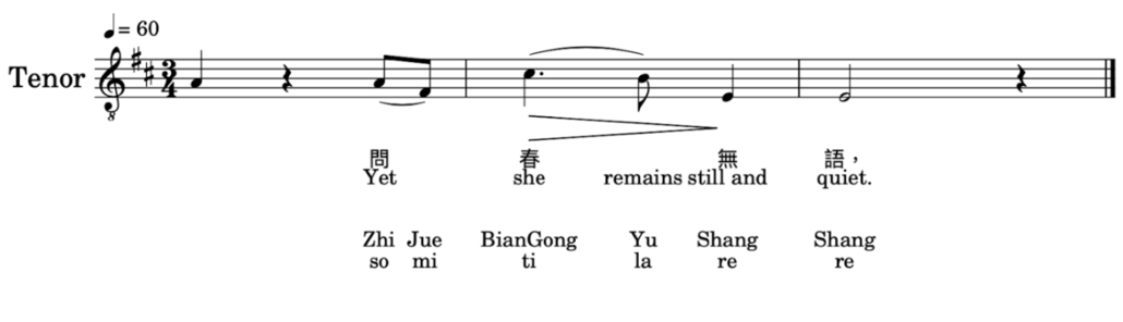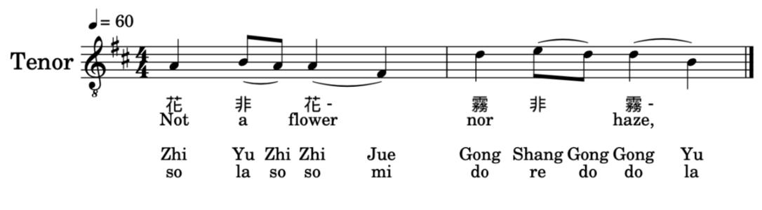 "A Flower in the Haze" is in the pentatonic D Gong mode (D Chinese Pentatonic), with 4 sentences in a total of 10 bars. The melody was completely based on the five relative tones. The relationship between the tones and letter name is as shown in the table below: