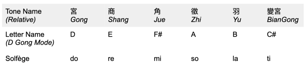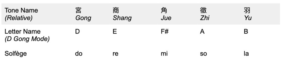 Chinese music mode is composed of two core elements: "tone 音"(relative) and "law 律" (absolute pitch). The concept of "tone" is similar to the Western solfège, referring to the five main notes, i.e., “Gong, Shang, Jue, Zhi, Yu”, known as pentatonic; and the “law” is referring to the 12 absolute pitches, which are of half-tone or semitone.