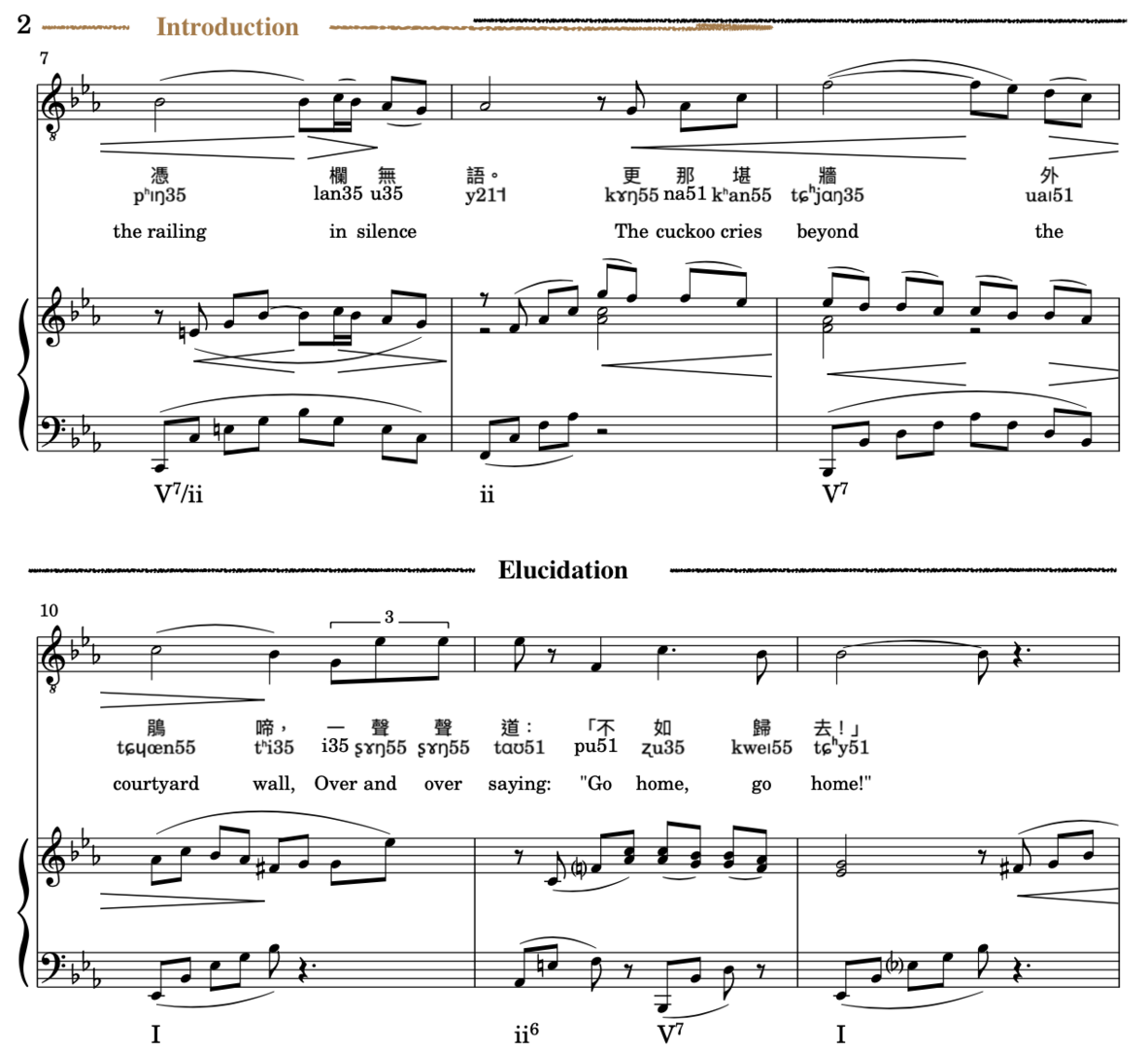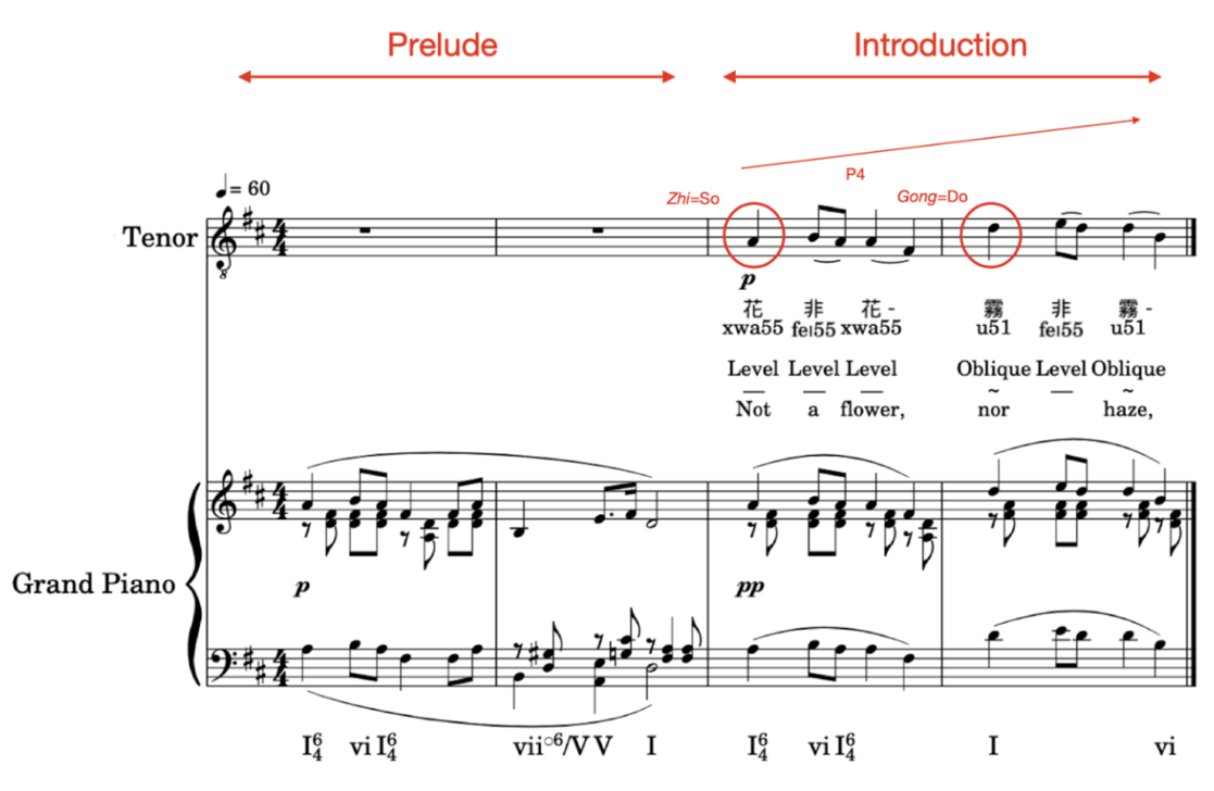 Part b refers to Elucidation, which appears in mm. 5-6. Elucidation means borrowing the ideas before to further develop. This phrase shares the same rhythmic patterns as before since there are the same numbers of characters and so rhetoric ideas. The overall trend is downward from again A (Zhi=So), the same note as in mm.3, the end of the phrase falls on E (Shang=re), and the accompaniment sound is extended, making the sonority soft and ear-wrenching. It is worth mentioning the harmony: the first bar mm.5 is the same as mm.3, but later on it develops to a different chord in mm. 6.