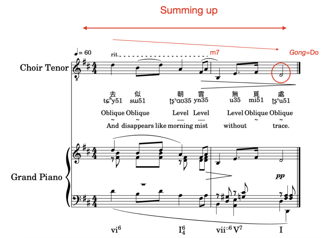 In the fourth sentence of the passage (part d), which is also Summary (mm. 9-10), the melody gradually descends with the emotional decline in line with the verse. In the word "cloud (雲, mm.9)" in the lyrics, a big jump of seven degrees down (Minor 7th) was used. In the end, the melody returned to the calm and composed D (Gong=Do), as if a beautiful dream became more and more blurred and disappeared. The end of the extension of the accompaniment gives people a feeling of indistinctness, adding to the mysterious atmosphere of the music.