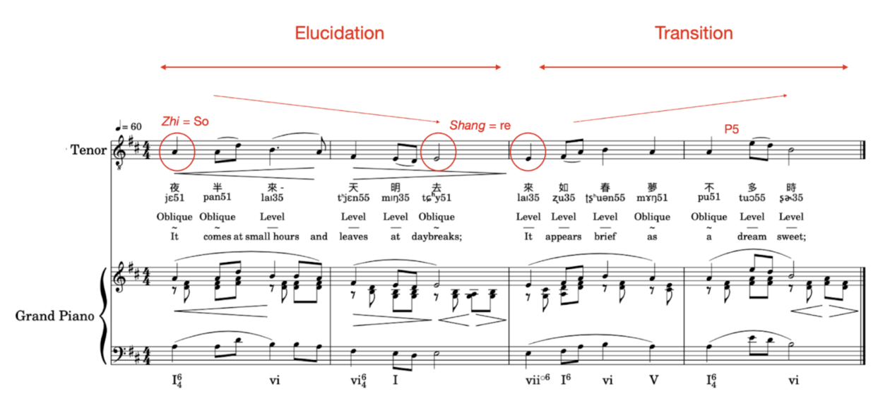 The third sentence embarks part C, which is Transition (mm. 7-8). This melody is a continuation of the previous line, following the ending sound E (Shang=re) of the previous sentence. Yet, the previous sentence goes down, on the contrary, this sentence progressively goes upward, making the melody very fluctuate. In the lyrics "brief (不多, mm.8)", the melody jumped up with five degrees (P5), pushing the whole song to a climax. After that, the melody gradually descends to the end, as if everything is as beautiful as “sweet dreams (春夢)”, but short and unpredictable.