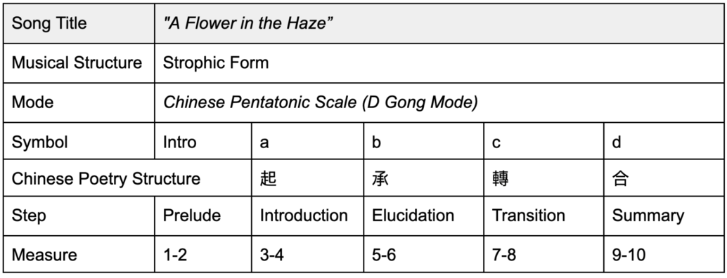 A Flower in the Haze is a lyric piece in strophic form. It adopts a stable four-beat and andante speed, the tune is melodious and beautiful, full of illusion and imagery. The poet uses flowers and fog as a hint of a mysterious beauty. The poem is short and concise, only four sentences express the recollection of the beautiful past and the melancholy of the injustice of reality. The atmosphere created by the poem is hazy, obscure and real.
