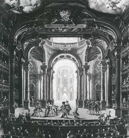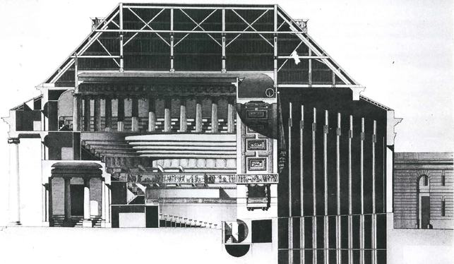 The first sunken orchestra pit was built only a bit later at the Theater at Besançon (1778-1784), France. The architect, Claude-Nicolas Ledoux, aimed at concealing the orchestra in order to increase the dramatic effect on the stage (Forsyth, 1985). The back wall of the pit was of a semi-cylindrical form, in order to act as a reflector. Strangely enough, in practice this element was an acoustic disadvantage, for the musicians experienced the music as disturbingly loud. It did not even have an effect on the audience because the concave wall directed the sound horizontally, in such a way that it could not even reach beyond the pit (Baumann, 2011).