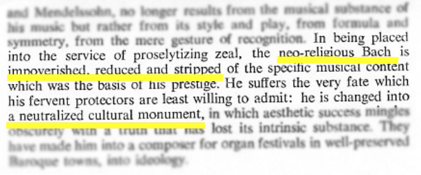 Part of what Adorno describes in his essay clearly relates to one of two trends that can be identified in the (technological) mediation of Bach and classical music more in general: democratisation, the idea of wide-spread availability and a breaking down of barriers between audience and music. (The second can be referred to as specialisation, a focus on and highlighting of Bach and his music.) Adorno’s focus in particular is on the universal availability which, according to him, deprives Bach of meaning: “his influence […] no longer results from the musical substance of his music but rather from its style and play, from formula and symmetry, from the mere gesture of recognition” (p.136, emphasis added) – an aspect that had already been pointed out seventy years earlier when it appeared that Bach’s works “are reverenced because they are known” (‘Bach Worshippers 1789, p.84). In sad consequence, Adorno feels that Bach has become “a neutralized cultural monument.” Similarly, Susan McClary has written in 1989 that much contemporary musical practice and understanding of Bach have “flattened him out into pure order,” “stifling” the music (p.56f); her focus strongly lies on the call for contextualising Bach and his music to counteract the romantic notion of the “music itself” that exists independently of the composer’s circumstances.