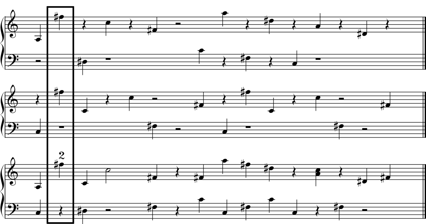 If a pianist interpreting classical music notation would see two notes of the same pitch and duration notated one after another, he would play them as two separate notes with a short but noticeable break in between. The same notation played by a computer, sending midi notes to a synthesizer generating a simple sinusoidal wave would sound like one continuous tone. In my notation, a note with the same pitch occurring in two and more consecutive samples means that the duration of the first one of them is prolonged until the sample where the value is not present. If two notes of the same duration and pitch should be performed one after another, there has to be a musical rest lying on a sample in between them.