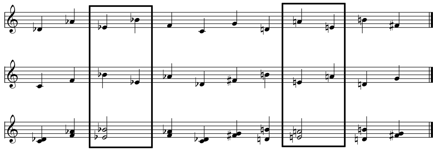 Following the described way of reading rhythms and dynamics, the notation allows for building up complex musical structures of harmony, rhythm, and dynamics by simple additive synthesis of matrices. What is more, midi-like notes based on integer numbers could be used instead of frequencies. Frequencies can be mapped onto integer numbers with the use of associative arrays. In programming languages, associative arrays are data types that store collections of pairs containing keys and values, for instance: [ midi note number 60, frequency 261.62 ]. However, when calculating values of a musical scale it is important to know that while frequencies belong to an exponential function y=x^2, integer numbers belong to a linear function y=x12. For this reason, in my notation, I call the system using frequencies “exponential” and the system using integer numbers “linear”. I explain this further in the next paragraph.