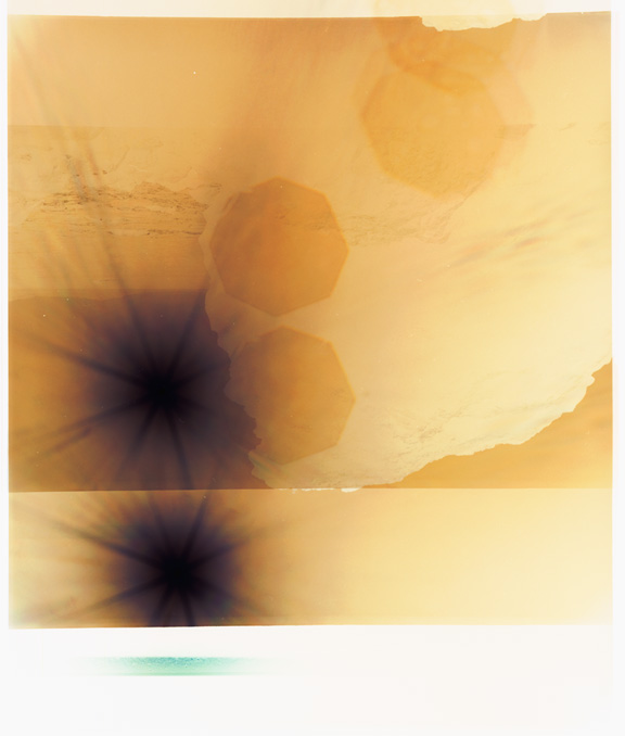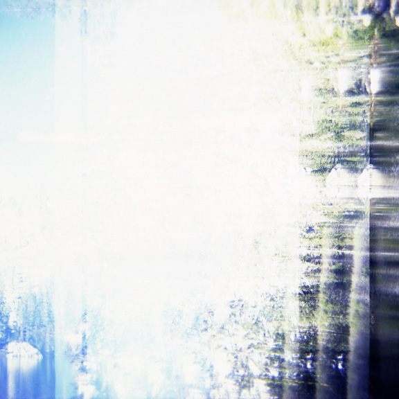 Here the artwork articulates the concept of the rushing sense of connectedness experienced in the natural landscape. The image expresses the reverberating impact of the rush of sensation, through staccato vertical tonal lines caused by multiple exposures and slight film advances. Pushing the in camera multiple exposure to an extreme, a composite cinema of multiple moments, the image transforms. From a repeated layering of the exposure on the film the reflected light of the elements of the landscape create a density of light, a white hole. A collaborative trust is imparted to the viewer, and space in the composition is given for their viewing particiapation. The image of the landscape is sacrificed for the suggestion of the experience, the visual elements merge into one unified field of white light.