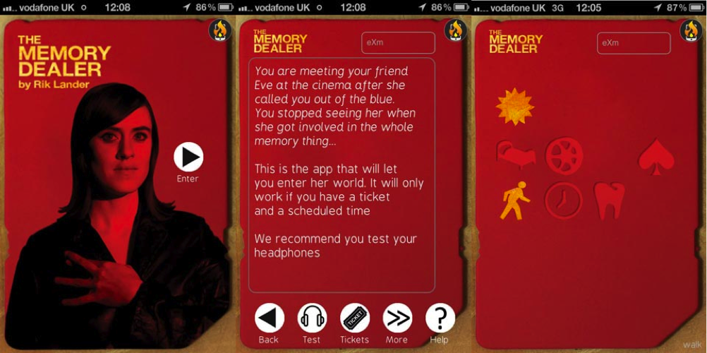 In addition, the area where players experience the drama has been flooded with flyers for memory phones, memitation classes, anti-legalization protests, mem-core club nights, and so on. On discovering these details, the boundaries of the fictional and real worlds become less clear, and this once more helps to make players suggestible. A frequent comment emerging from the audience feedback referred to them not knowing where the real/unreal boundaries of the experience were.