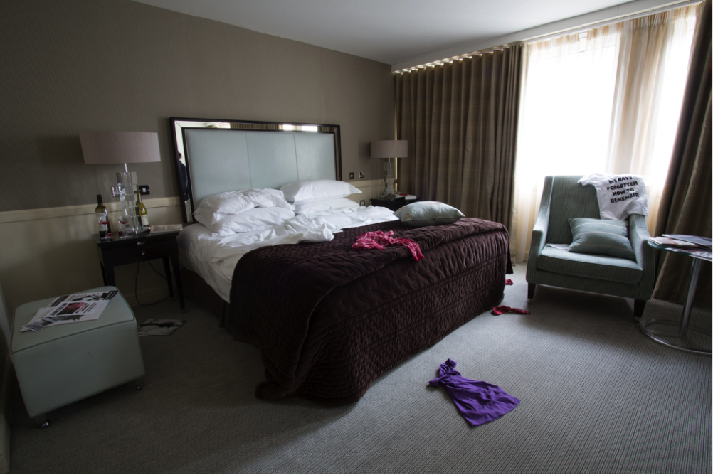 Figure 5: Eve’s hotel room, scattered with props. The two pillows play “his and hers” soundtracks. TMD Iteration 4, Bristol, May 2013. Paul Blakemore.
