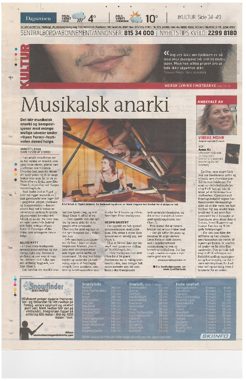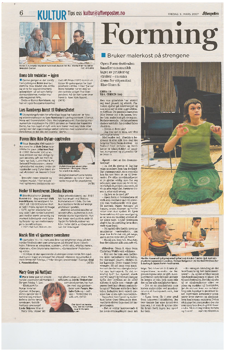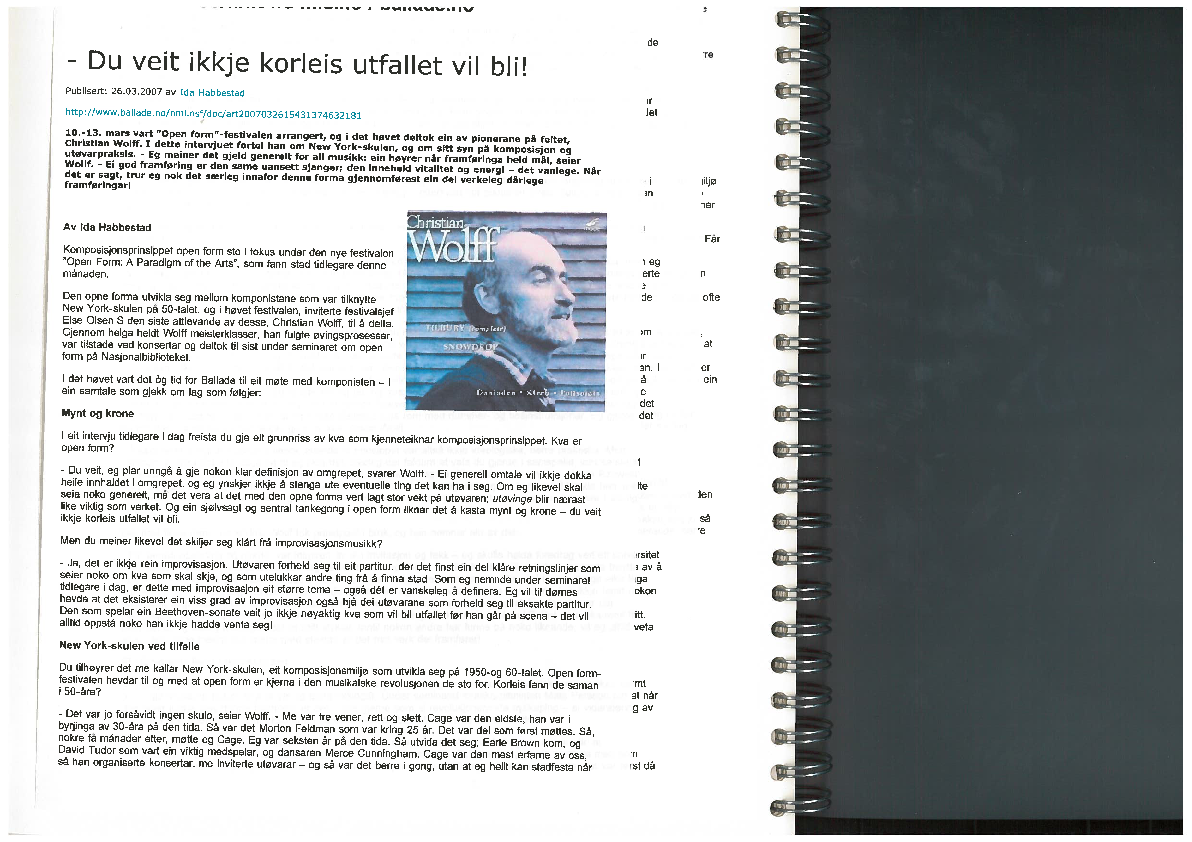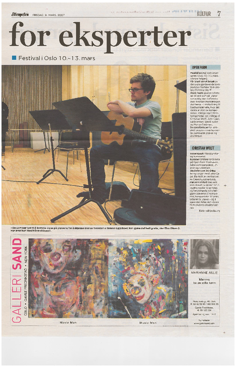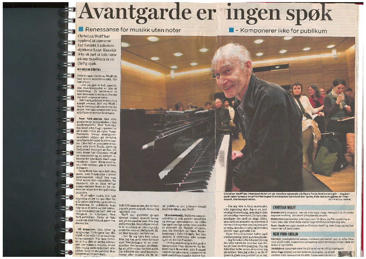In 2007, Christin Wolff was festival guest and composer. He participated as a performer in both his own works and related works by John Cage, Cornelius Cardew, and world premieres by Norwegian composers.