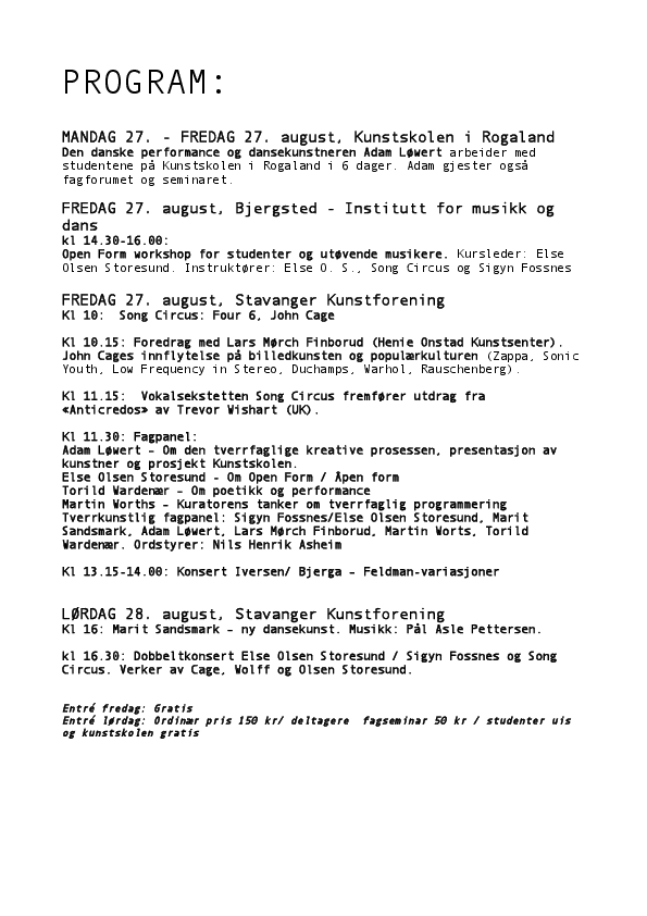Open form is a designation on a type of composition that is in some degree open. It is also a term in relation to understanding a genre. This means that I do not include for example Bach´s Die Kunst der Fuge (circa 1740), but Stockhausen´s Aus den sieben Tagen (1968) could be included. This project, however, is centered around the composers from The New York Scool, and composers related to The New York School: Christian Wolff, Pauline Oliveros, John Cage, Earle Brown, Morton Feldman and Cornelius Cardew. An Open form composition is graphic, text- or number-based. It may also be a combination of these three notational techniques and/or in combination with conventional staff line-notation.