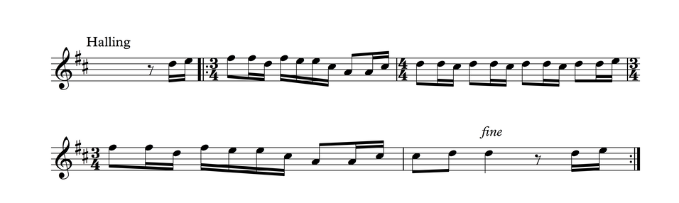 The tunes are often named after certain musicians (“Sprengar etter Johannes Brekken”, for example), or they may be linked up to areas where they have been used (“Bruremarsj fra Brekstad”). With few exceptions, they consist of two or three eight-bar sections that are repeated. Some halling tunes have uneven time signatures, because this particular form of mostly individual dancing is based on pulse rather than periods. Some regions have beats of uneven lengths - it is a common perception, for example, that many pols tunes from the Røros area have a “prolonged” second beat, but not everyone agrees that this is what the performers feel themselves when they ́re playing.