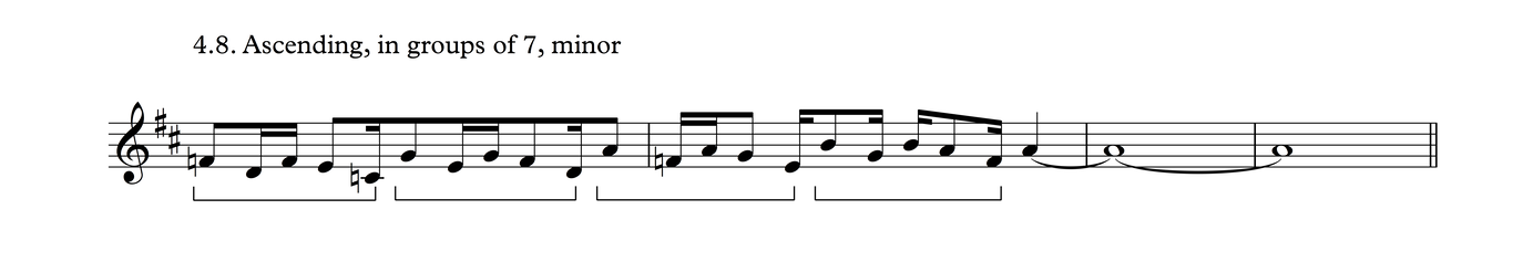This particular melodic profile is very common not just in this time signature, but also as triplets over 3/4, as we shall see in Process 5. The development of this phrase follows the same layout as Process 3.