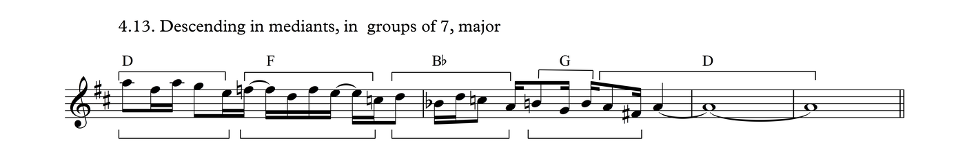 This particular melodic profile is very common not just in this time signature, but also as triplets over 3/4, as we shall see in Process 5. The development of this phrase follows the same layout as Process 3.