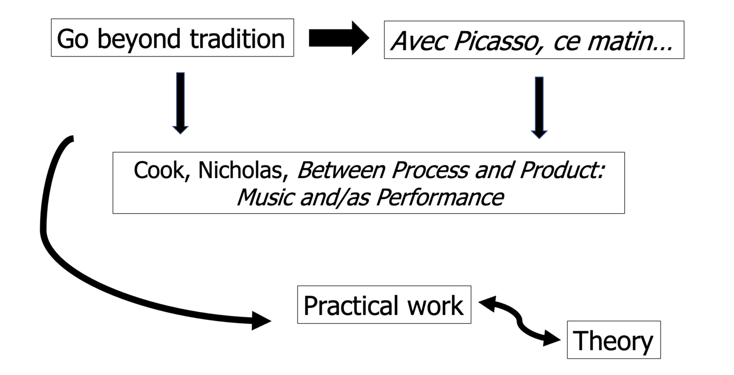 As I enrolled on my master’s at the Koninklijk Conservatorium, I considered exploring this piece, as a case study for how a work’s interdisciplinarity elements can influence the performer. I hoped to realize through this proposal how the understanding of the interdisciplinary elements of Avec Picasso, ce matin… could lead me to the creation of a larger interdisciplinary performance. I also contemplated resorting to collaborative work as a tool to achieve such an end.