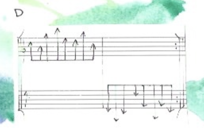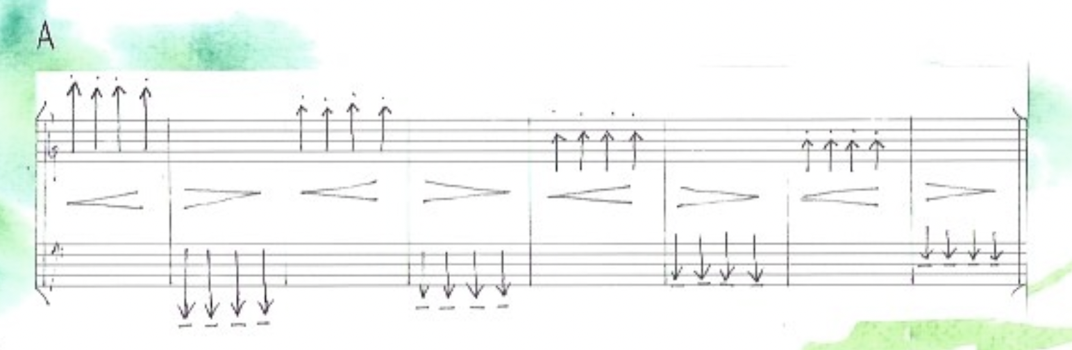 Even if we cannot see it in a literal way, all the cubes of Catarina’s piece are related to Avec Picasso, ce matin…’s cubes. As I referred earlier, we understood that the pitches on Capdeville’s cubes were subservient to the gesture, like they work as a vehicle to movement and not the other way round. Catarina took this idea to the extreme and conceptualized cubes only as gestures. She doesn’t write concrete pitches. Instead, she writes a gestural direction in which notes must be played, but these are random and less important than the gesture itself.