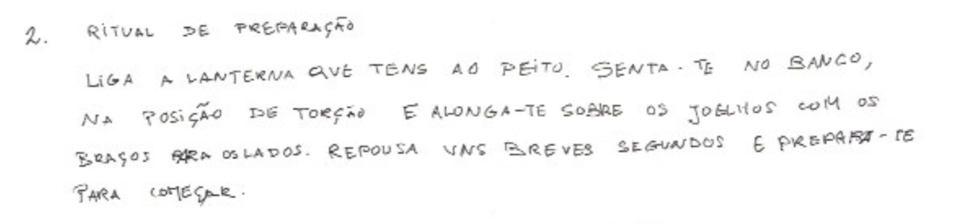 There are, however, some materials related to the piece that could help achieve a performance closer to what Constança Capdeville envisioned. These consist of: the two aforementioned scores - Madalena Soveral’s (MS) score and Portuguese National Library’s (PNL) score; the performance resources (tape, light and scenic script); the composer’s program note written for the 10th Edition of Gulbenkian’s Contemporary Music Meetings in 1985; a text about the piece in Maria João Serrão’s book Constança Capdeville. Between Theatre and Music and a recording of the piece presumably made by Jorge Peixinho. In spite of a seemingly good amount of available sources, none of them are completely clear and objective, often presenting contradictions and leading to misunderstanding.