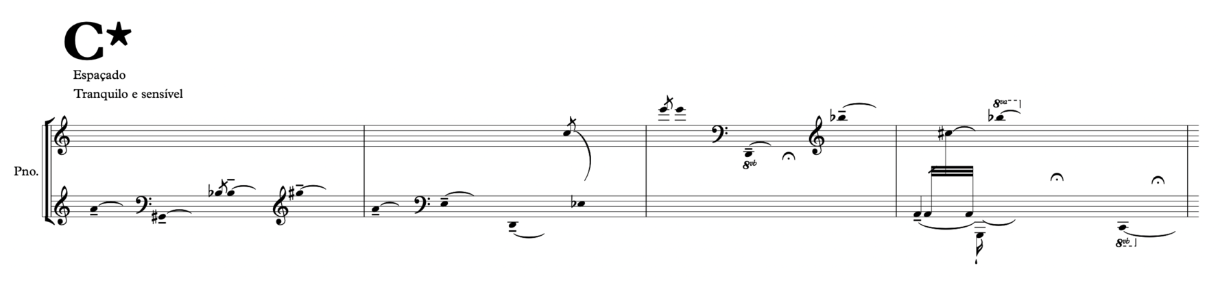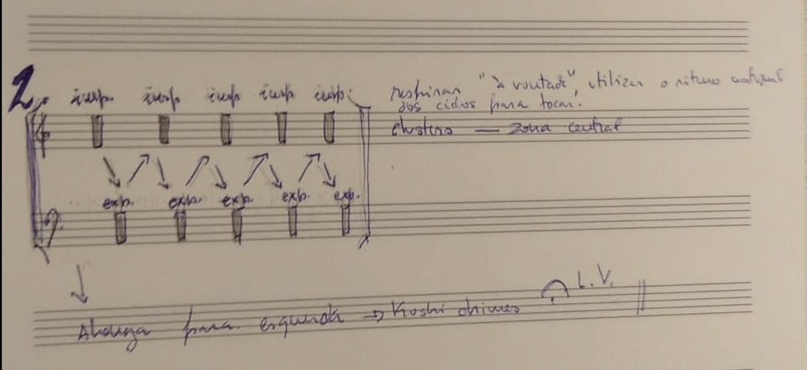 Since the audio quality of the "scraps" was poor and disparate from the piece's tape, we ended up resorting more to the transcription of these sounds to the acoustic realm. I made some experimentation on the piano and later transcribed the chosen excerpts with the aid of a music notation software. In the transcription process I tried to stay as close as possible to the timbral, rhythmic and expressive qualities of the original audios. Per exemple: