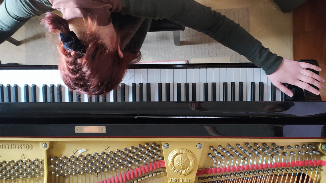 As gesture and stretch became increasingly important concepts in our discussions, we thought about the idea of “deconstruction of the pianistic gesture”. In other words, to decompose the basic ideas of the piano technique and playing, or playing in very unnatural ways. We took the Portuguese pianist Joana Sá’s performance A body listening: virtuosity as unbridgeable gap resounding7 as the basis for our discussion. I had seen this performance two years prior to my collaboration with Catarina. One particular moment got stuck in my head since then: at some point in the performance, Joana Sá played a piece in a very unnatural way, her head bended towards one side and her elbows very high, only her fingertips could touch the keyboard. I found this image extremely beautiful and it got me thinking how that was the complete opposite to everything we learn during our piano studies. I shared this image with Catarina, who found it extremely inspiring and got interested in learning more about Joana Sá’s work. She ended up watching one of Joana Sá’s interviews8 and later a concert of Joana Sá with Henrique Fernandes at Guimarães Jazz festival.