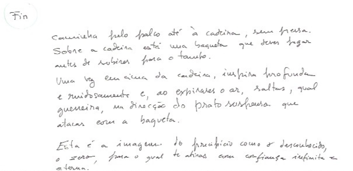 This final movement of the piece – jumping from the chair towards the gong – is meant to represent release. The concept of release was something highly discussed in our meetings and is deeply linked with the ideas of mediation and stretching. Both meditation and stretching can be seen as means of achieving release: the former, mental release; the latter, physical release. We also discussed about how getting older could be a form of liberation. We played with the idea of metamorphosis in this context, a "metamorphosis of freedom" as Catarina called it. On this subject, Catarina wrote what I believe became the synopsis of the piece: