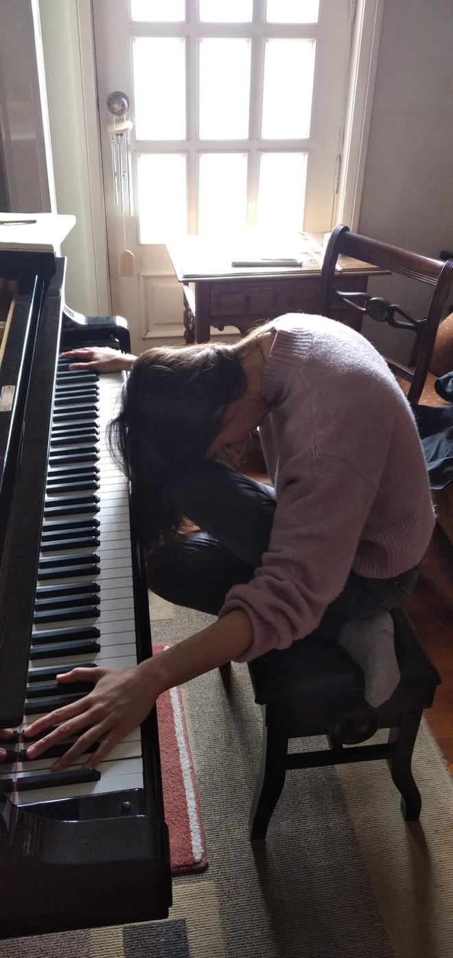 As gesture and stretch became increasingly important concepts in our discussions, we thought about the idea of “deconstruction of the pianistic gesture”. In other words, to decompose the basic ideas of the piano technique and playing, or playing in very unnatural ways. We took the Portuguese pianist Joana Sá’s performance A body listening: virtuosity as unbridgeable gap resounding7 as the basis for our discussion. I had seen this performance two years prior to my collaboration with Catarina. One particular moment got stuck in my head since then: at some point in the performance, Joana Sá played a piece in a very unnatural way, her head bended towards one side and her elbows very high, only her fingertips could touch the keyboard. I found this image extremely beautiful and it got me thinking how that was the complete opposite to everything we learn during our piano studies. I shared this image with Catarina, who found it extremely inspiring and got interested in learning more about Joana Sá’s work. She ended up watching one of Joana Sá’s interviews8 and later a concert of Joana Sá with Henrique Fernandes at Guimarães Jazz festival.