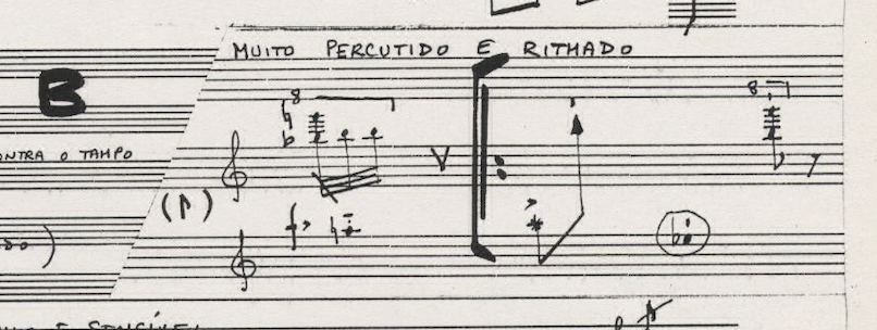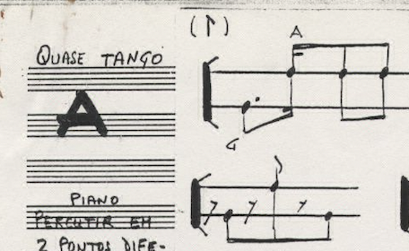 The recitativo and the cube A of the piece were also altered. The recitativo, originally played in temple blocks, was switched for the marimba improvisation presented above. We chose this excerpt because of its similitude to the original recitativo: not only this excerpt was originally played in a percussion instrument but also presented an improvisatory and free character. To emulate a more percussive sound we opted to play this part muffling the piano’s strings. The cube A, originally a sequence of rhythms to be played in the piano soundboard and accompanied by the indication “quasi tango”, was replaced by a simple and naïve dance for guitar and piano we found on the "scraps". Like in the original audio, we decided to maintain the muffled strings on the melody.
