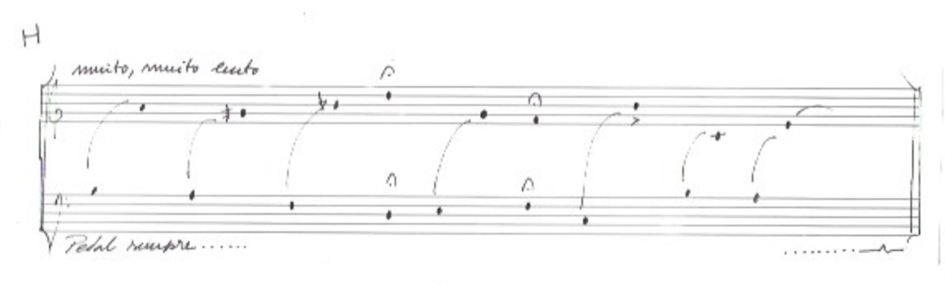 Since the audio quality of the "scraps" was poor and disparate from the piece's tape, we ended up resorting more to the transcription of these sounds to the acoustic realm. I made some experimentation on the piano and later transcribed the chosen excerpts with the aid of a music notation software. In the transcription process I tried to stay as close as possible to the timbral, rhythmic and expressive qualities of the original audios. Per exemple: