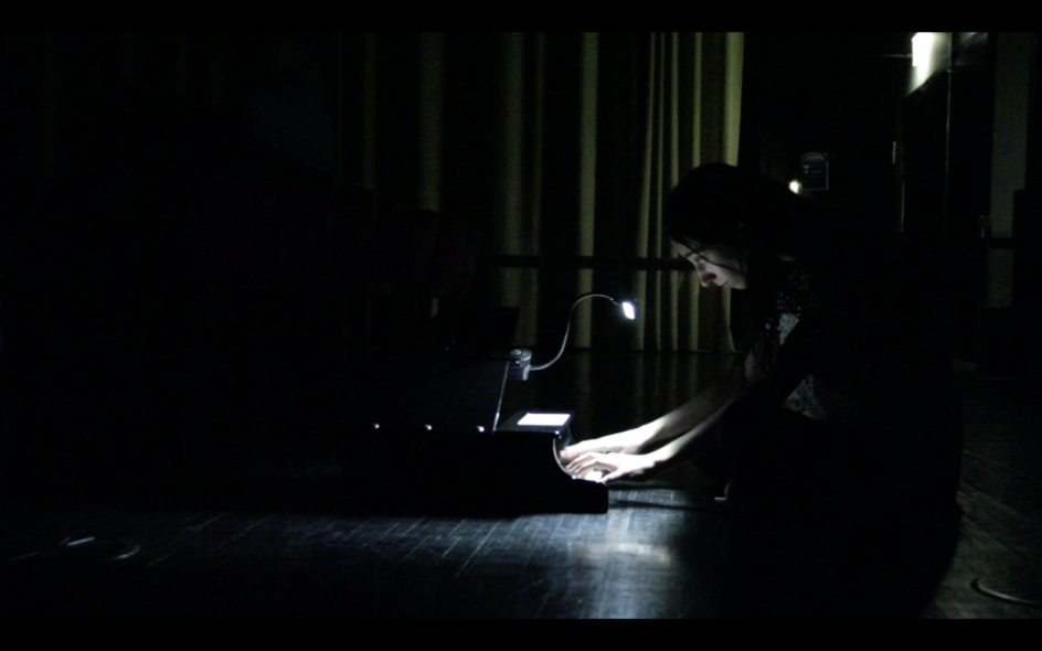 Starting with my collaboration with Mónica, one cannot deny that we both depended on each other on the development of the type of work we undertook. Mónica, as a musicologist, presented to me materials I wouldn’t be able to access if not through our collaboration. Furthermore, she was the one who suggested using these materials in our work. On the other hand, Mónica's knowledge on performance was lacking. Even though she was able to suggest hypothesis on how to apply these materials on the context of our work, she depended on me not only to perform it on stage but also to find a way to make it possible to execute. To a certain extent, I ended up having a greater influence on the final result of the collaboration. I was the one who came with the possibility of transcribing the sounds on tape to the acoustic realm and undertook that effort; I suggested adding new "cubes" or replacing the material of already existing ones with materials reminiscing of the “scraps” tape; I developed most of the theatrical scene’s script; finally, I was the one who actually performed the piece on stage and decided how to connect the cubes. To be completely fair, Mónica also had an influence on the final outcome. For instance, she had suggested adding parts of the “scraps” to the tape which resulted on the addition of the music box part to the tape on the prelude; she was also the one who suggested starting the piece off-stage and that I should point the flashlight towards me while playing with my back facing the audience. However, communication problems were getting more frequent during our collaboration and this pressured me into making all final decisions without asking for her opinion and consent.