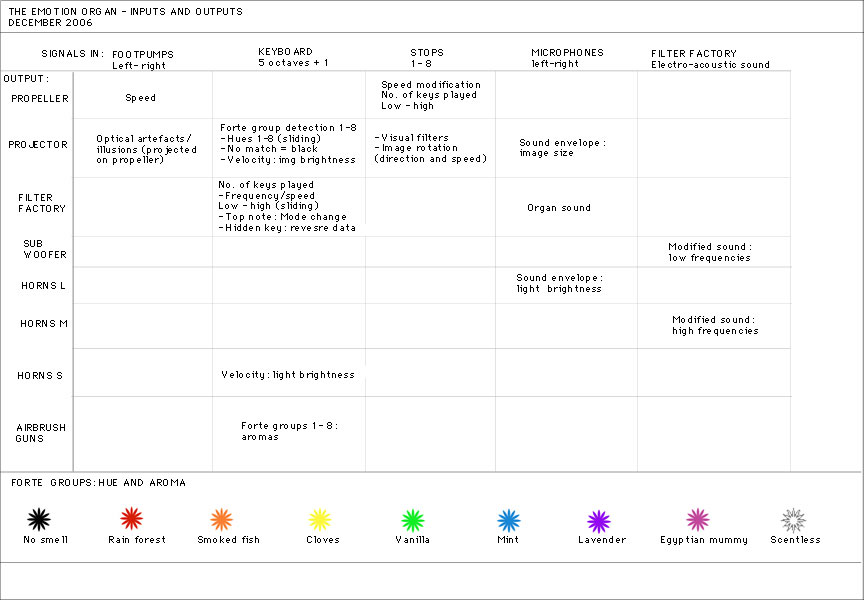 Then I applied these criteria as an initial blueprint for designing and programing the Emotion Organ, also envisaging how it could function in different modes, such as: