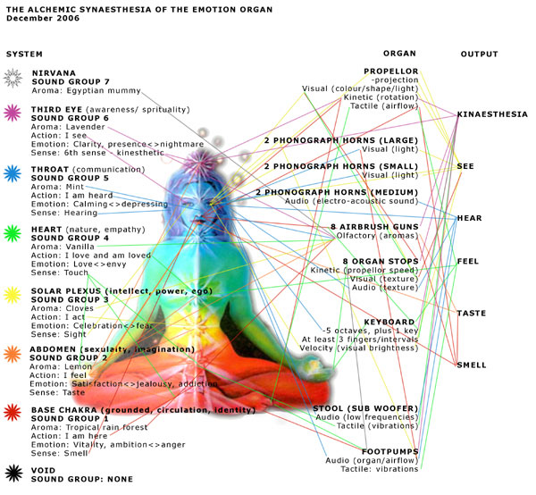 I applied different systems for the desgin and progamming of the organ. I first took the criteria for diagnosing 'true' synaesthesia as proposed by neurologist Richard Cytowic who, in the mid 2000’s when I started to build the organ, claimed that we are all born as Syns but that our synaesthetic abilities diminish as we grow older. He said that synaesthesia is: