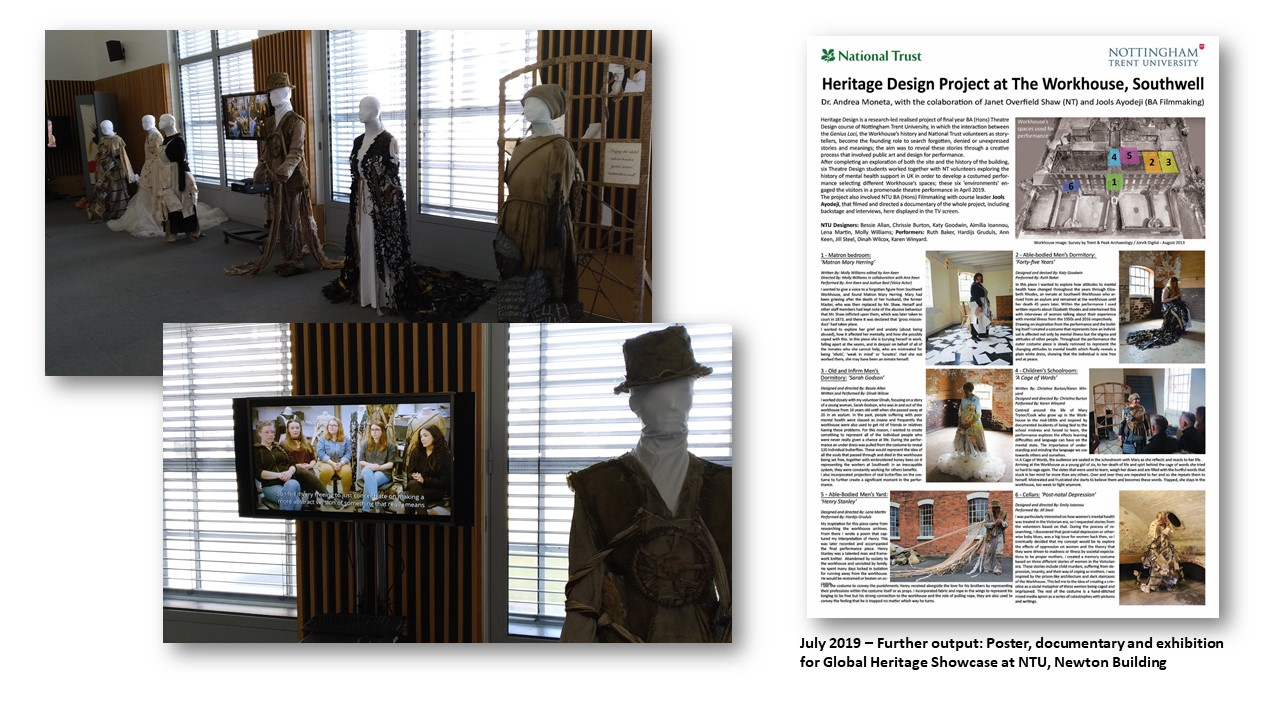 Heritage Project at The Workhouse, Southwell, is a 5-year long collaboration partly funded by National Trust with Nottingham Trent University; it was enabled by National Trust’s Research Strategy aimed at ‘fulfilling the role of heritage in the modern world, realising experiences that move, teach and inspire’. The project was focused on The Workhouse, Southwell to reveal its Genius Loci (distinct character), to unearth its forgotten, denied and unexpressed stories; and to unveil them through Scenarchitecture, Moneta’s performative methodology that utilises architecture and performance to provoke visitors to think differently about history, identity and today’s world. Scenarchitecture blends Imagination with Memory using a given architectural site; it works with the complex overlay of historical and contemporary fragments embedded in the host building, and it combines them with the stories, memories and meanings of the people that lived there. The aim of this process is to unveil feelings, to reveal invisible links between places and people, using perception and sensibility. Moneta’s project was developed through research-led teaching: since 2015, a number of Theatre Design students had been involved as active researcher for content creation; they had been paired with Workhouse’s volunteers to engage with the building and its archive material; together, they devised different 'stories' inspired by The Workhouse’s archive; in the first two years of development the project inspired students’ installations; from 2017, after gaining interest from National Trust, the ‘stories’ evolved into a collective, costumed promenade performance open to public around The Workhouse, with the volunteers as storytellers and Moneta as project manager and director. The project is now a regular and popular feature of The Workhouse’s Public Programme inspired by a specific year’s theme. Outputs included photos and video, website and blog, newspaper article, exhibition; in 2019, a documentary captured the development of the project and final performance.