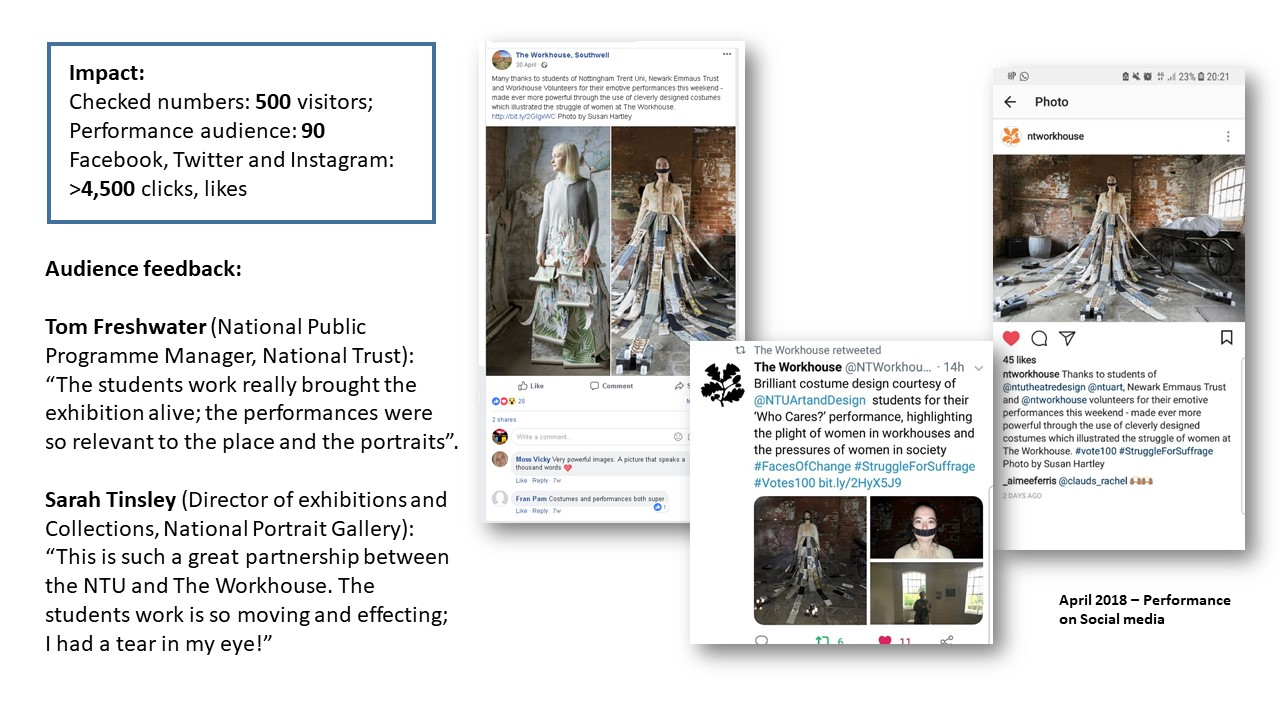 Heritage Project at The Workhouse, Southwell, is a 5-year long collaboration partly funded by National Trust with Nottingham Trent University; it was enabled by National Trust’s Research Strategy aimed at ‘fulfilling the role of heritage in the modern world, realising experiences that move, teach and inspire’. The project was focused on The Workhouse, Southwell to reveal its Genius Loci (distinct character), to unearth its forgotten, denied and unexpressed stories; and to unveil them through Scenarchitecture, Moneta’s performative methodology that utilises architecture and performance to provoke visitors to think differently about history, identity and today’s world. Scenarchitecture blends Imagination with Memory using a given architectural site; it works with the complex overlay of historical and contemporary fragments embedded in the host building, and it combines them with the stories, memories and meanings of the people that lived there. The aim of this process is to unveil feelings, to reveal invisible links between places and people, using perception and sensibility. Moneta’s project was developed through research-led teaching: since 2015, a number of Theatre Design students had been involved as active researcher for content creation; they had been paired with Workhouse’s volunteers to engage with the building and its archive material; together, they devised different 'stories' inspired by The Workhouse’s archive; in the first two years of development the project inspired students’ installations; from 2017, after gaining interest from National Trust, the ‘stories’ evolved into a collective, costumed promenade performance open to public around The Workhouse, with the volunteers as storytellers and Moneta as project manager and director. The project is now a regular and popular feature of The Workhouse’s Public Programme inspired by a specific year’s theme. Outputs included photos and video, website and blog, newspaper article, exhibition; in 2019, a documentary captured the development of the project and final performance.