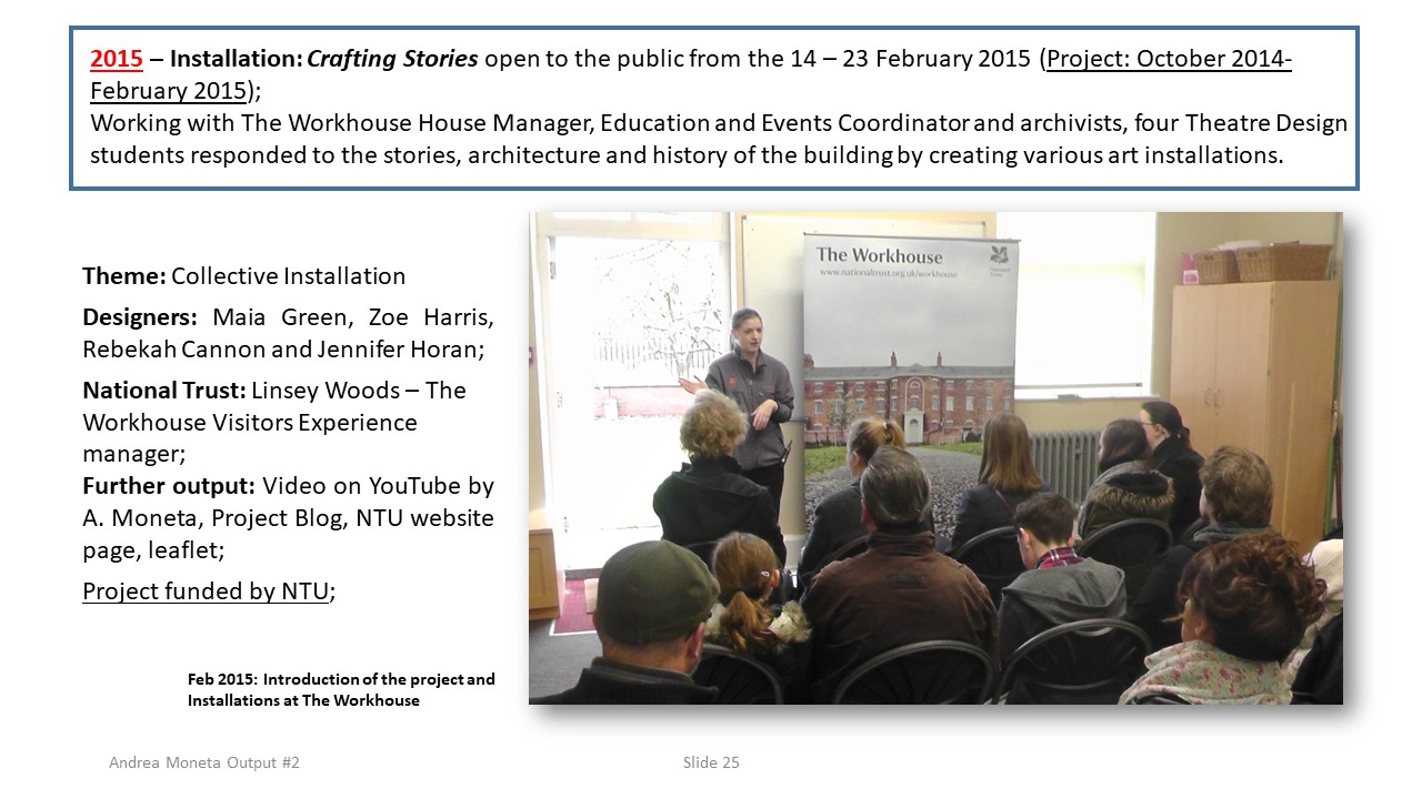 Heritage Project at The Workhouse, Southwell, is a 5-year long collaboration partly funded by National Trust with Nottingham Trent University; it was enabled by National Trust’s Research Strategy aimed at ‘fulfilling the role of heritage in the modern world, realising experiences that move, teach and inspire’. The project was focused on The Workhouse, Southwell to reveal its Genius Loci (distinct character), to unearth its forgotten, denied and unexpressed stories; and to unveil them through Scenarchitecture, Moneta’s performative methodology that utilises architecture and performance to provoke visitors to think differently about history, identity and today’s world. Scenarchitecture blends Imagination with Memory using a given architectural site; it works with the complex overlay of historical and contemporary fragments embedded in the host building, and it combines them with the stories, memories and meanings of the people that lived there. The aim of this process is to unveil feelings, to reveal invisible links between places and people, using perception and sensibility. Moneta’s project was developed through research-led teaching: since 2015, a number of Theatre Design students had been involved as active researcher for content creation; they had been paired with Workhouse’s volunteers to engage with the building and its archive material; together, they devised different 'stories' inspired by The Workhouse’s archive; in the first two years of development the project inspired students’ installations; from 2017, after gaining interest from National Trust, the ‘stories’ evolved into a collective, costumed promenade performance open to public around The Workhouse, with the volunteers as storytellers and Moneta as project manager and director. The project is now a regular and popular feature of The Workhouse’s Public Programme inspired by a specific year’s theme. Outputs included photos and video, website and blog, newspaper article, exhibition; in 2019, a documentary captured the development of the project and final performance.