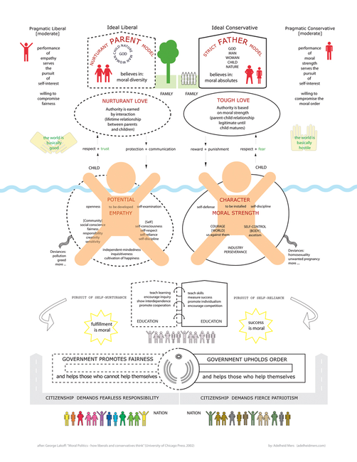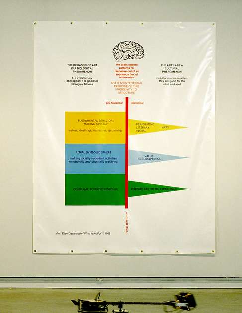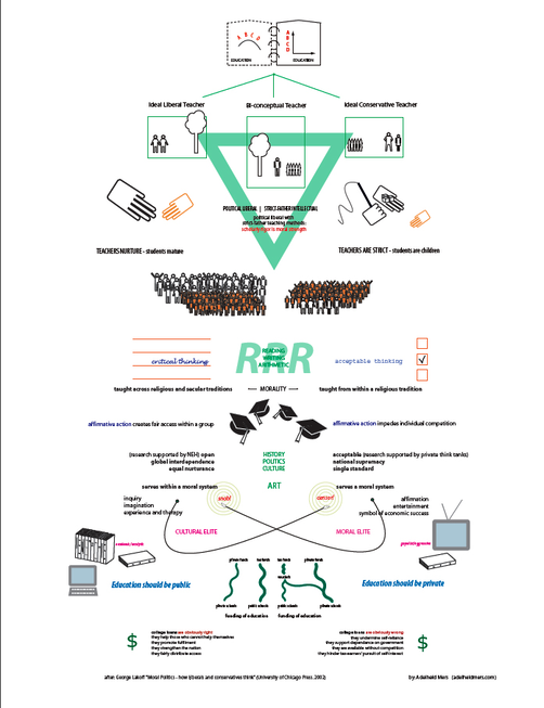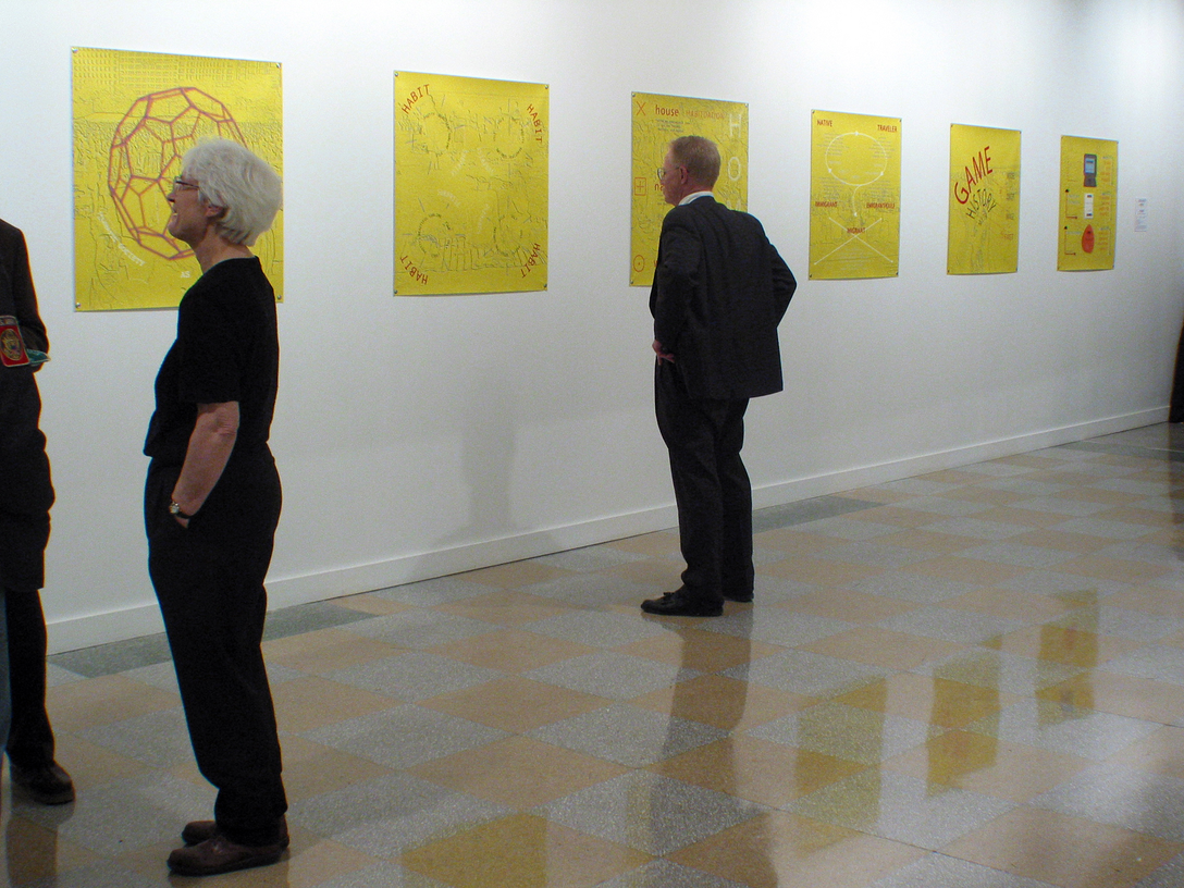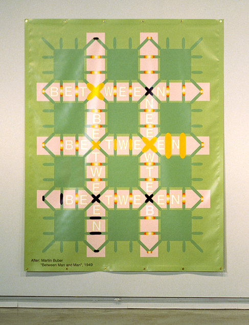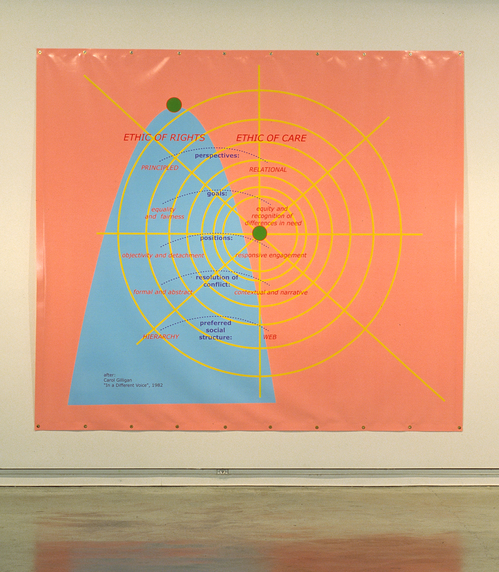 The exhibition, "Backgrounds and Conversations", 2004, in Chicago, was a participatory installation, an expanded, spatial diagram, grounded by three images after George Lakoff's "Moral Politics - How Progressives and Conservatives Think'". Core phrases were suspended throughout, inviting visitors to pose under them. The work was later also exhibited at Drake University, Des Moines, IA, in tandem with a symposium on political value formation.