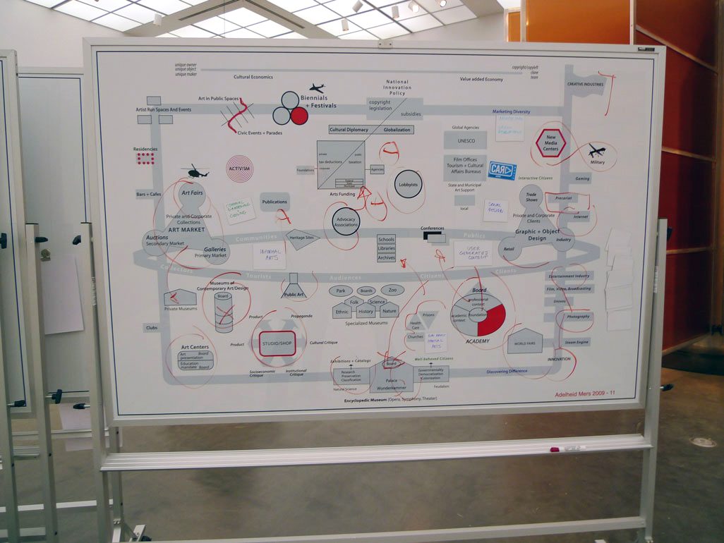 In 2011, Tricia van Eck organized audience activations as part of the exhibition, Without You I’m Nothing: Art and Its Audience, at the MCA Chicago. My contribution was a weeklong series of performance lectures, delivered every day at lunch time, using five, two-sided, prepared whiteboards. They included a diagram of arts organizations and their stakeholders (above), a diagram after Benjamin's "The Work of Art in the Age of Mechanical Reproduction", a diagram of Flusser's "Exile and Creativity", a wordless curatorial concept (a year later realized as the "Hairy Blob" at the Hyde Park Art Center), and a diagram after Duchamp's lecture "On the Creative Act", juxtaposed with Torrance's model of stages of creativity.