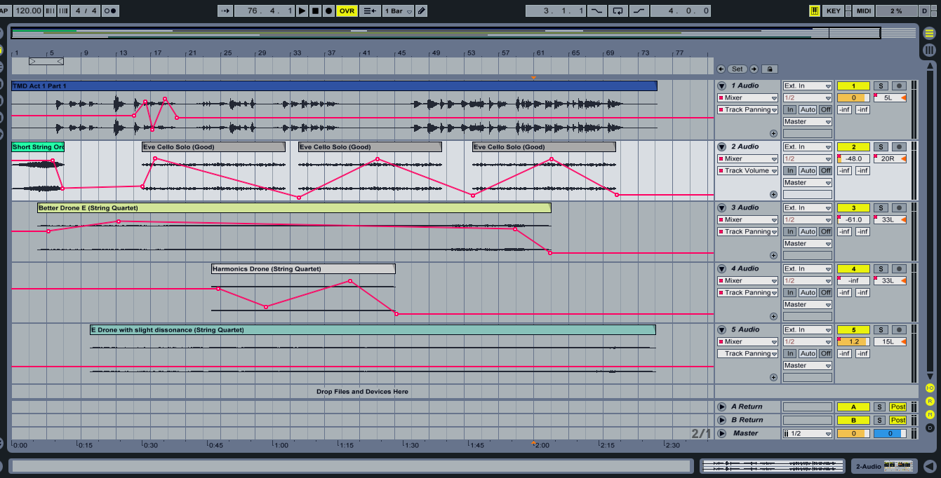 This was, in part, covered in the previous section, and the layering and branching techniques, if applied properly, constitute something of a solution for this problem. In addition to that was the use of audio samples, again also already discussed. In practice, the production was not complete until the night before the performance itself; that this has profound implications for the design of the music should go without saying. It became necessary then to have established a compositional environment befitting a bespoke approach to composition and score design. Having already discussed how the musical materials lent themselves to such an approach, a sequencer software (in this case, Ableton Live) provided the practical backdrop against which this was possible. Figure F shows the working environment, in which a track featuring the voice-over (which was prone to change at short notice) could be supplemented by a drag-and-drop treatment of exported audio samples. Additional mastering and digital manipulation could be applied to the audio within this environment. Though this was an, at times, primitive approach, it facilitated an easy and ultimately economical back-and-forth relationship between the creation of music and other technical aspects involved in the production of the drama.