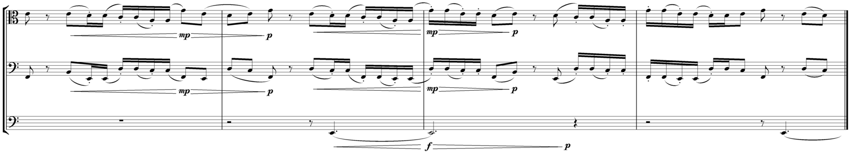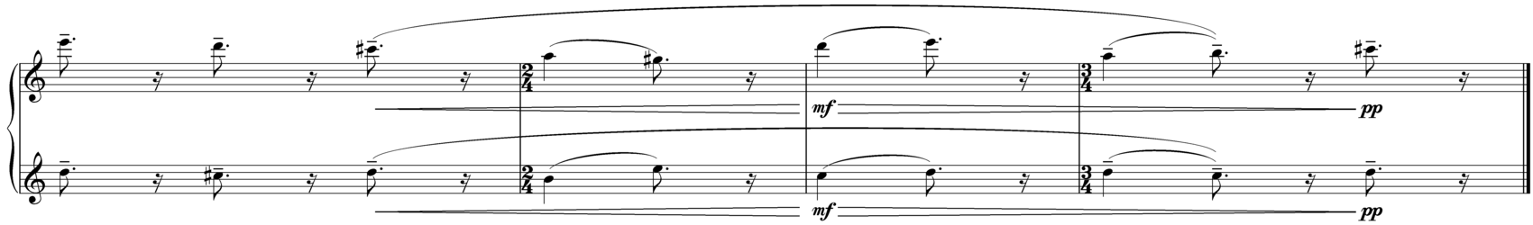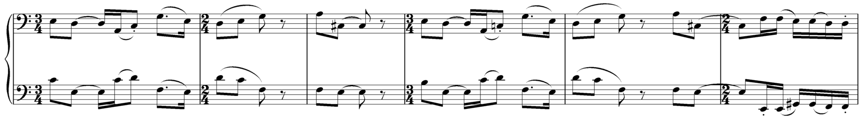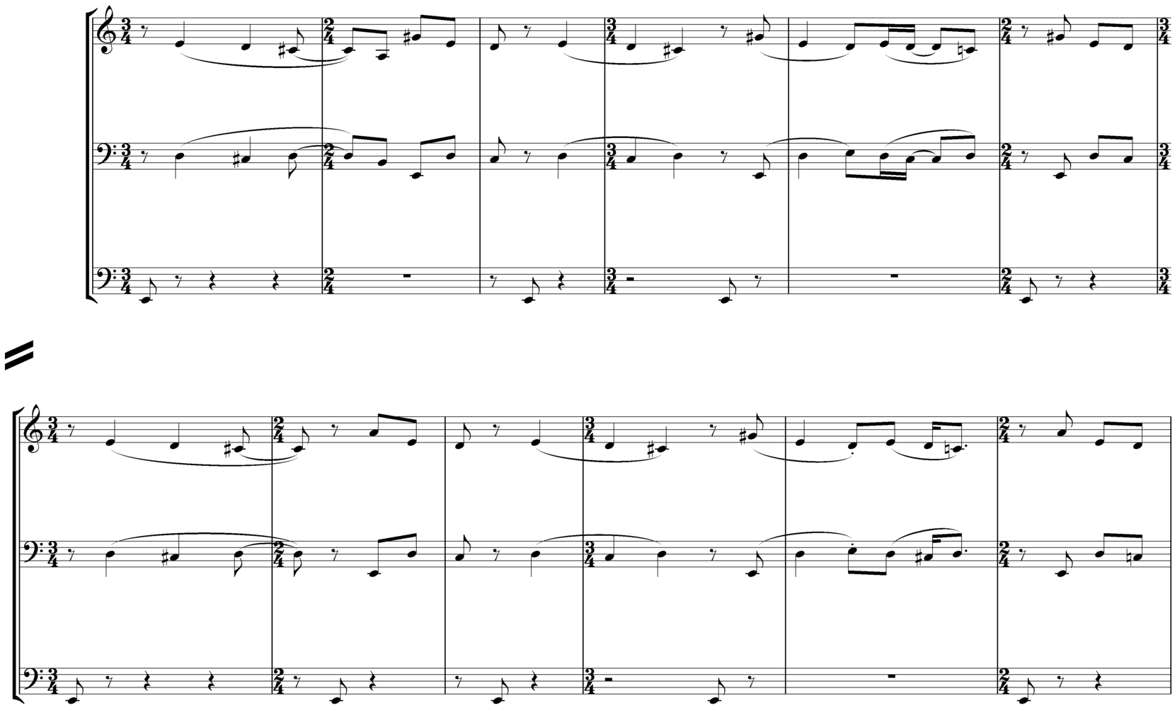 Figure C below is an accompaniment motif with melodic qualities. It was conceived as a kind of multi-accompaniment that could support, if dramatic demands called for it, all three melodies discussed in this section. Likewise, it contains a number of intentionally subtle rhythmic distortions, such as the syncopated E pedal (which likewise reinforces the E Mixolydian character), the syncopations in the opening E-D-C# - which are corrected two bars later from the last beat of the third bar – and the near-repetition with a slight rhythmic variation on the fifth bar.