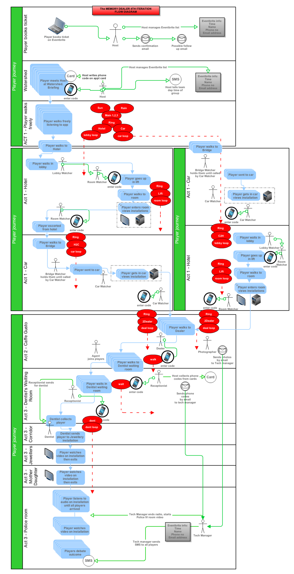 The Memory Dealer is a ‘pervasive’ drama. Rather than sit in a darkened theatre, the audience (we call them players) have to move through the real world, visit locations, meet characters and exercise some agency over the outcome of the tale. The plot has the level of complexity of a movie and the player is a character in that movie, the scenes of which happen in sets or real places. An indication of the level of complexity and number of scenes can be gleaned from the following flow diagram. Player actions are in blue boxes. For example: ‘Player walks freely listening to app,’ ‘Player walks to hotel,’ etc. The red ovals represent the file names of the app audio. The audio soundtrack, listened to by the players on headphones, is the primary story-telling tool. It takes the form of a narration in a male voice, a musical score, sound effects, and character voices.
